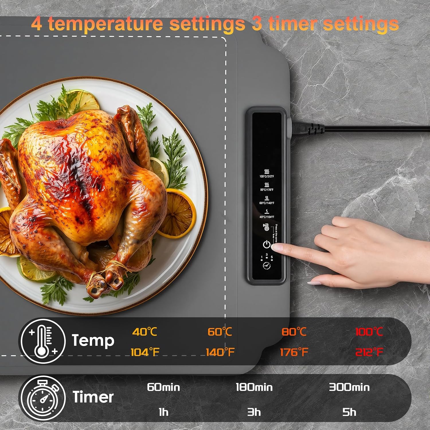 - 【Vier einstellbare Temperaturstufen & Timing im dritten Gang】Dieser Elektrische Warmhalteplatte für Speisen vier Temperaturstufen: 40 °C, 60 °C, 80 °C und 100 °C. So bleiben Ihre Speisen länger warm und lecker und Ihr Esserlebnis wird zum