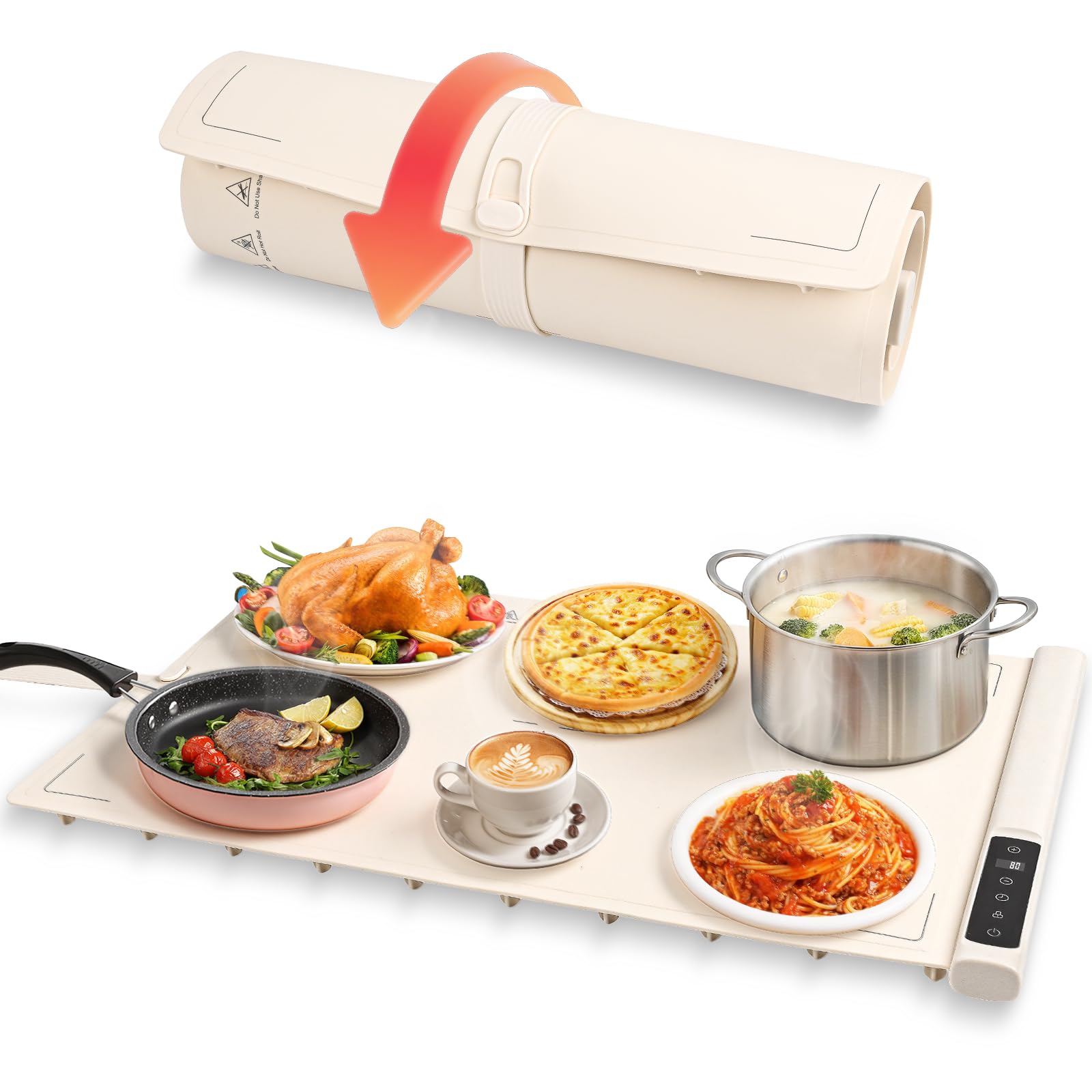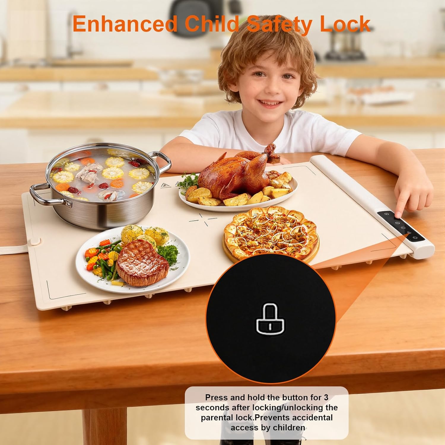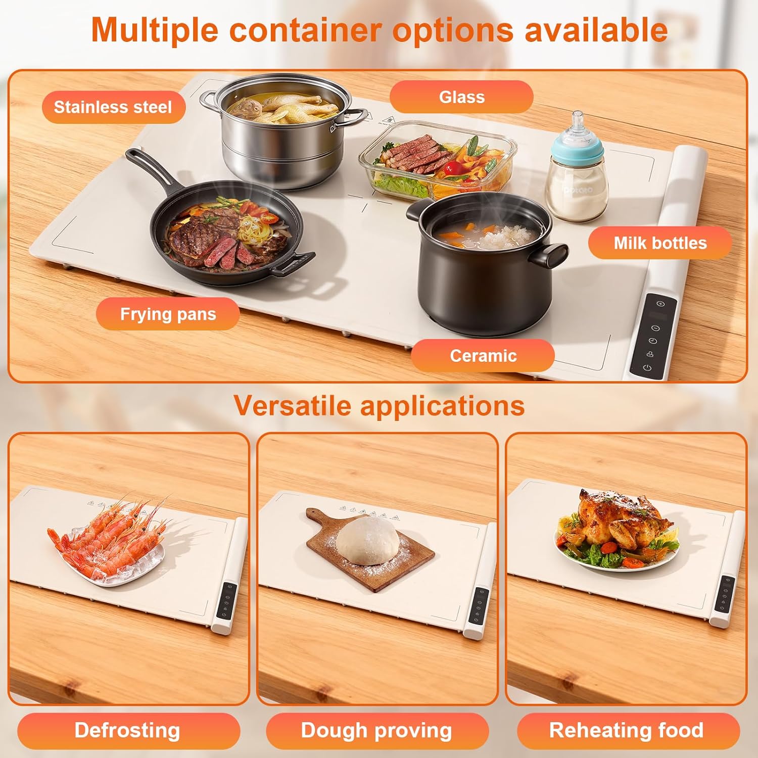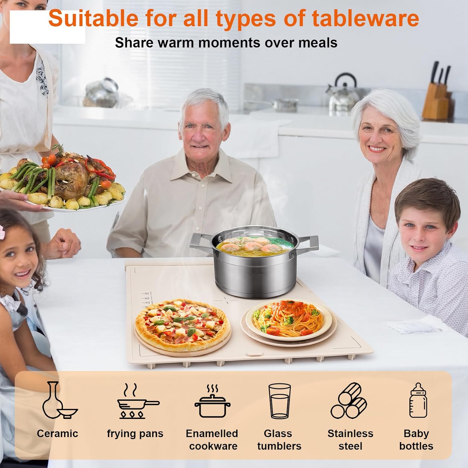 - 【Effizientes Heizen, hohe Kompatibilität】Heizfläche: 63 x 40 cm, Länge des Netzkabels: 2 Meter. Ob Keramik, Glas oder Kunststoff – unsere Wärmeplatte ist mit allen Geschirrarten kompatibel. Perfekt für Suppen, Fleisch, Desserts und vieles
