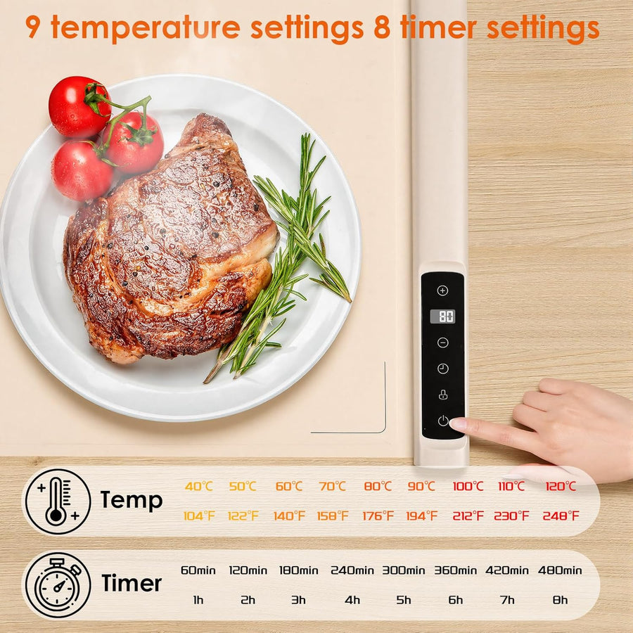 - 【9 einstellbare Temperaturstufen & 8 Timing im dritten Gang】Dieser Elektrische Warmhalteplatte für Speisen vier Temperaturstufen: 40 °C, 50 °C, 60°C, 70°C, 80 °C, 90°C, 100°C, 110 und 120 °C. So bleiben Ihre Speisen länger warm und lecker