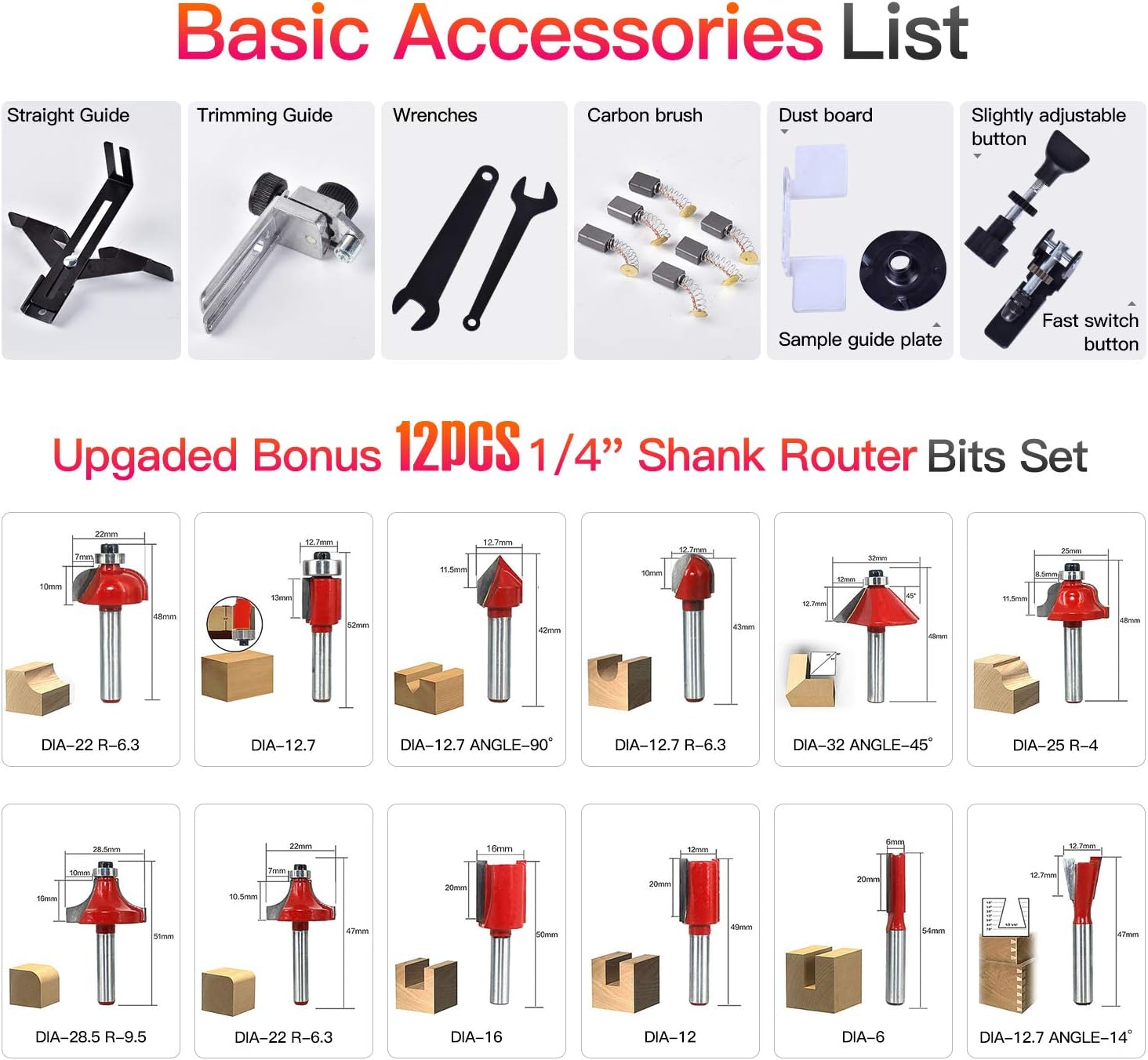 - 【Lieferumfang】 -1 x Elektrisches Trimmerholzwerkzeug, 1 x Fräser, 1 x gerade Führung, 1 x Führungsplatte, 1 x Trimmerführung, 2 x Schraubenschlüssel, 6 x Kohlebürste, 1 x Schraube, 1 x Schraube 1 x Anweisung.