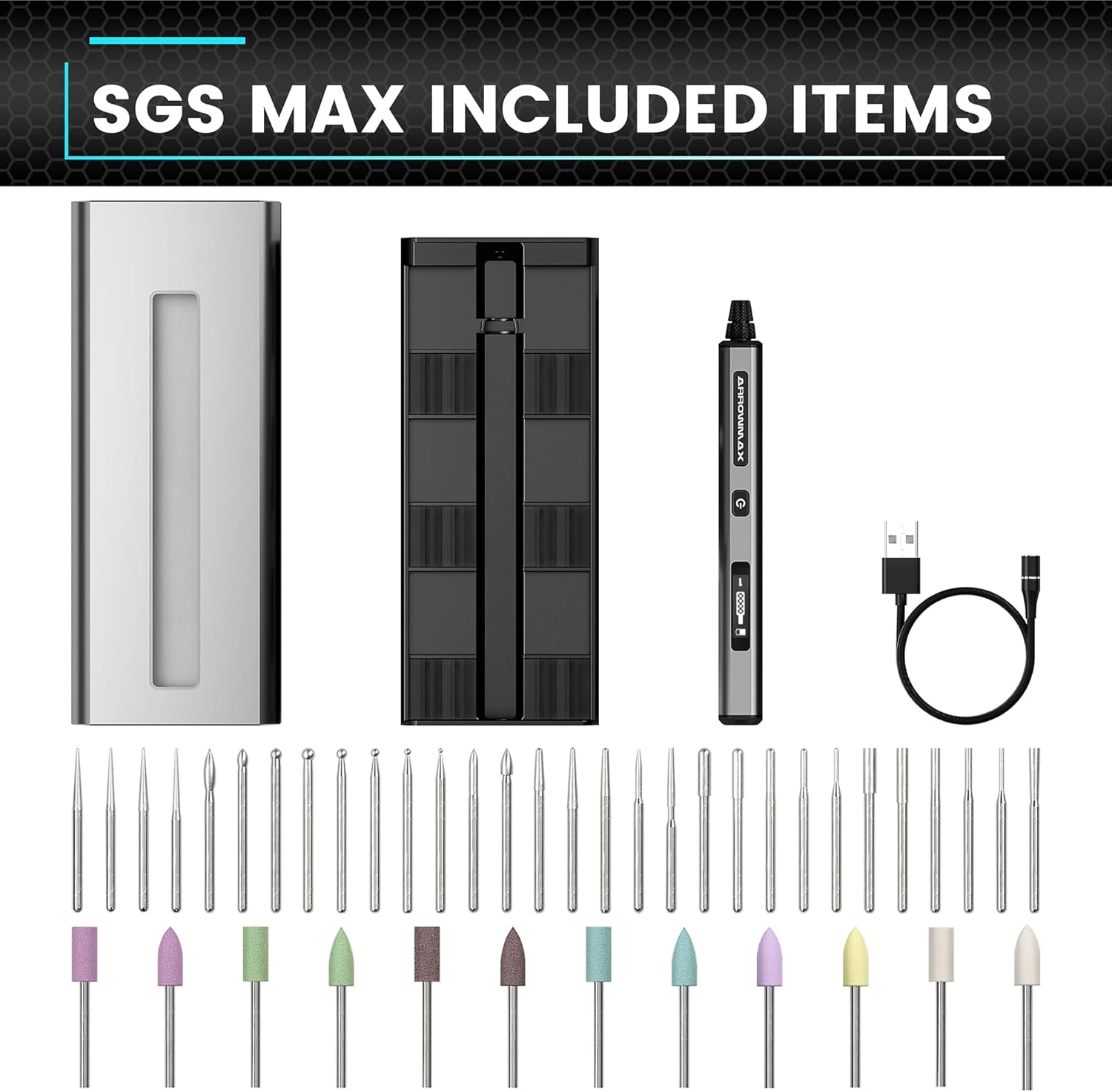 - Umfassendes Werkzeugarsenal: Lassen Sie Ihrer Kreativität freien Lauf mit einem umfassenden Satz von 42 Aufsätzen, die Vielseitigkeit für Aufgaben von Schleifen und Polieren bis hin zu Biegen und Gravieren bieten. Das SGS MAX-Gravierwerkzeug umfasst