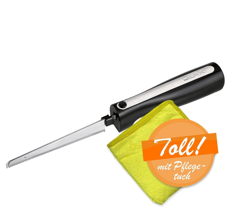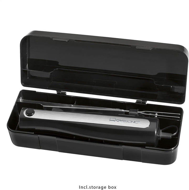 - ✅ EIGENSCHAFTEN - Elektromesser - 120 Watt - Geräusch- und vibrationsarmer Lauf - Aufbewahrungsbox - Spezialgezahnte Doppelklingen, Edelstahl rostfrei, spülmaschinengeeignet - Farbe: schwarz