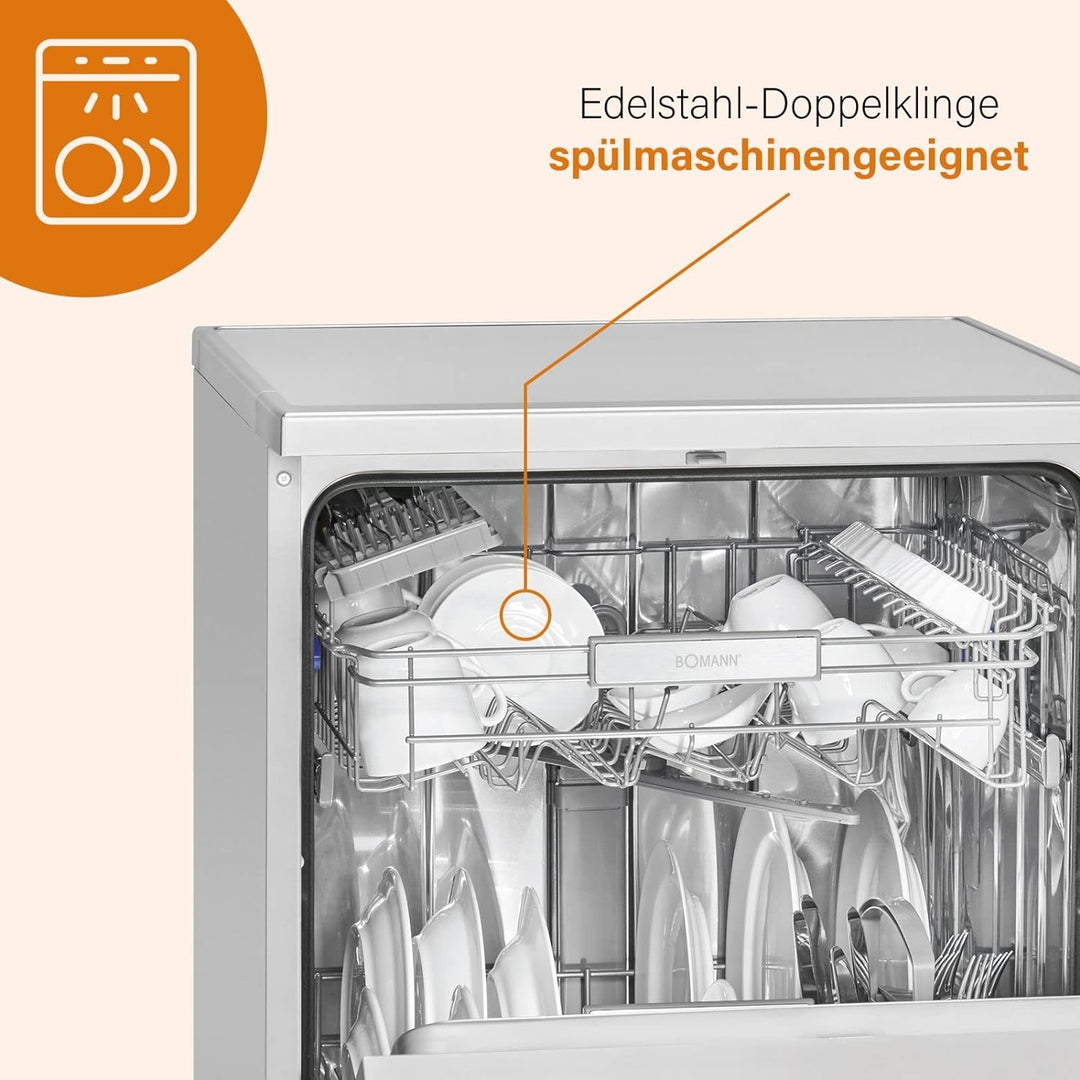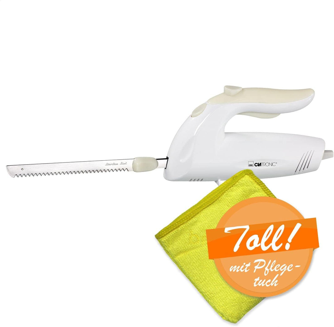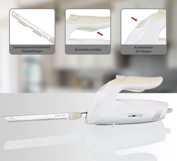 - ✅ EIGENSCHAFTEN - Elektromesser - 150 Watt - Geräusch- und vibrationsarmer Lauf - Sicherheits-Schalter - Auslöse-Taster für Klingen - Spezialgezahnte Doppelklingen, Edelstahl rostfrei, spülmaschinengeeignet - Farbe: weiss