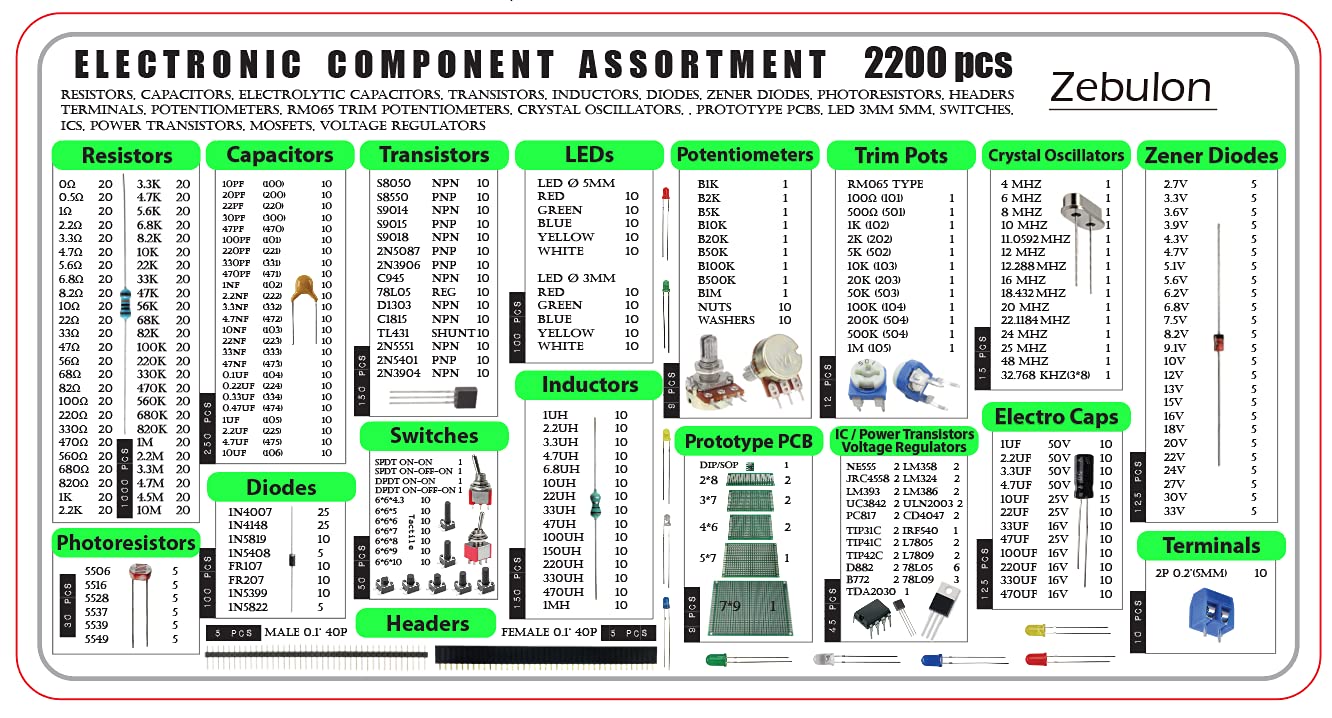 - Widerstände, Kondensatoren, Transistoren, Dioden, Zener Dioden, Drosseln, ICs Chips, Quarz Oszillatoren, Platinen, Minischalter, Kippschalter, Potentiometer, Trimmer, LDRs, LEDs, Klemmen, Stiftleisten