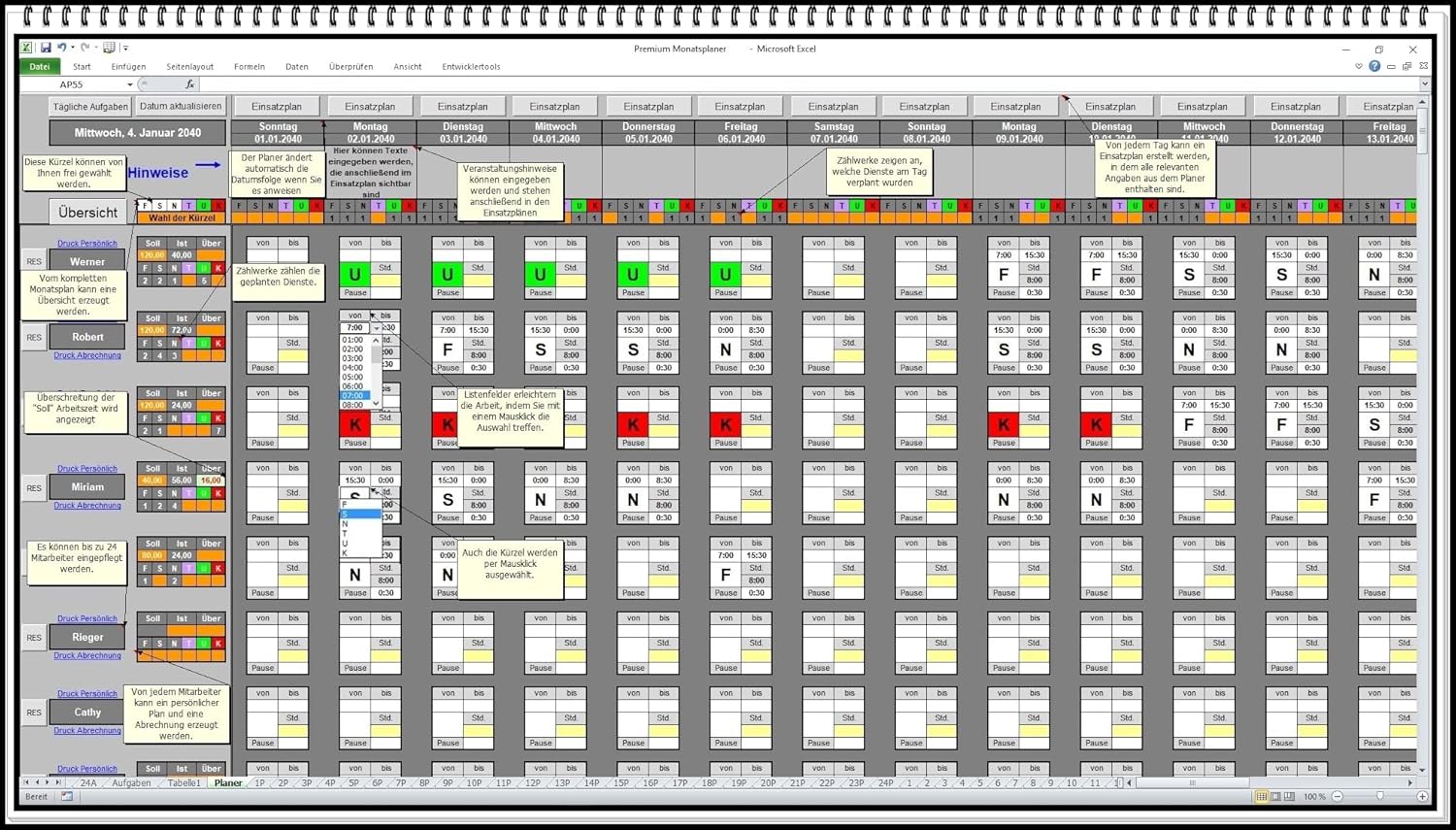 - Erzeugt automatisch einen auf den Mitarbeiter bezogenen Einsatzplan zum ausdrucken
