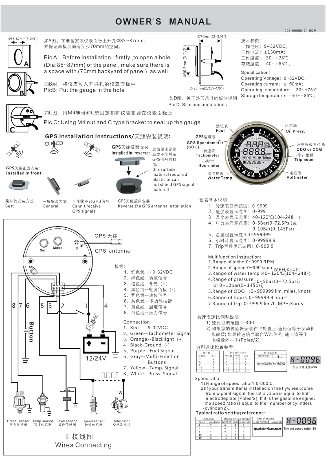 - Funktion: digitaler GPS-Tachometer, digitaler Drehzahlmesser, Betriebsstundenzähler, COG/ODO, Kilometerzähler, Wassertemperatur, Kraftstoffstand, Öldruck, Voltmeter. Wenn Sie Tachosensor benötigen, pls. suche nach ASIN NO. B07WPXL7WQ oder B07WPXFH34