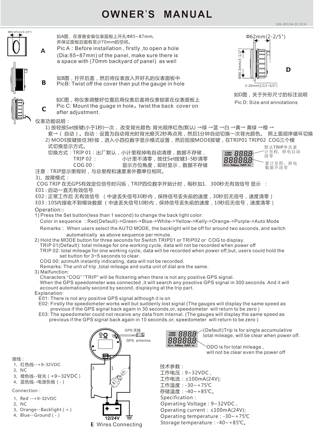 - Einfach anzuschliessen, 3-adrige Verbindung (Strom, Erdung, Beleuchtung). Dies ist eine komplette Einheit, kann direkt mit GPS-Sensor zusammen arbeiten, keine anderen Sensorkabel erforderlich.