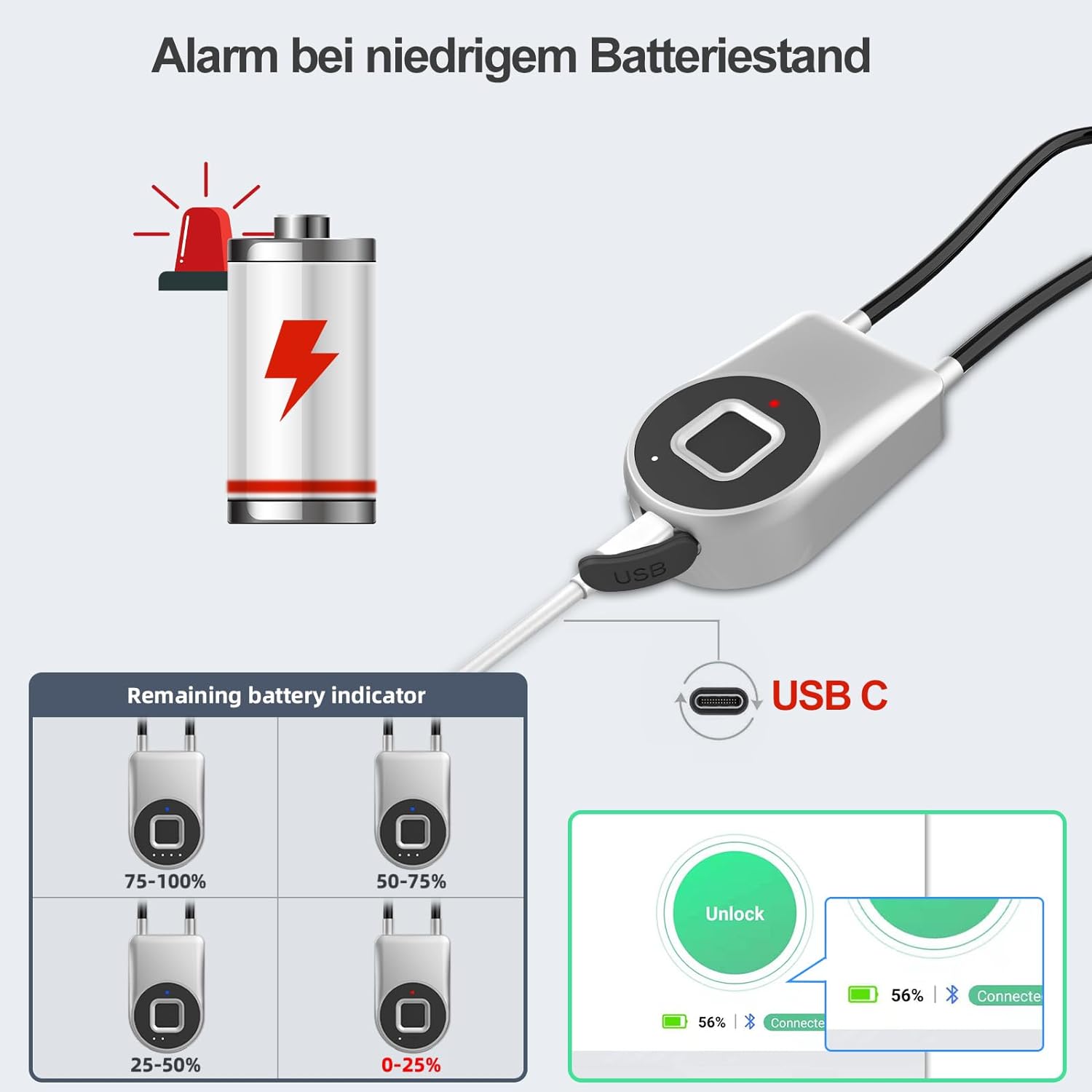 - 【Extreme Laufzeit und USB C Ladefunktion】 Smart Warehouse-Vorhängeschloss mit Batterieanzeige, niedrigem Stromverbrauch und langem Standby. Der wiederaufladbare Lithium-Akku kann 6 Monate Standby-Zeit unterstützen und kann mehr als 2000 Mal