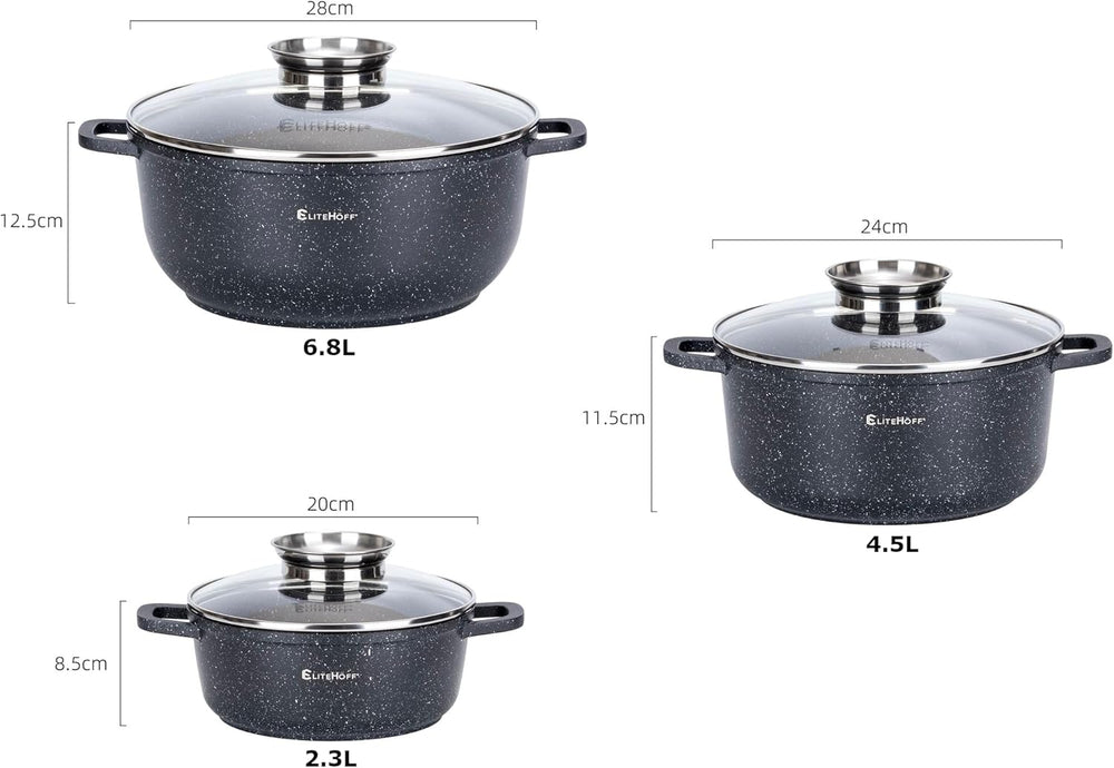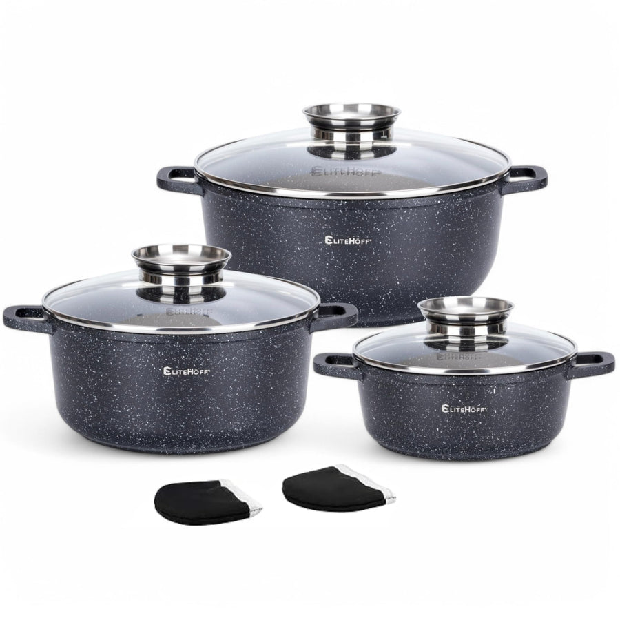 - ✅ Erhältlich in verschiedenen Sets und Farben: Diese Kochgeschirrsets sind in Varianten mit 3, 4 oder 6 Töpfen und passenden Deckeln erhältlich und in zwei eleganten Farben: Schwarz oder Grau.