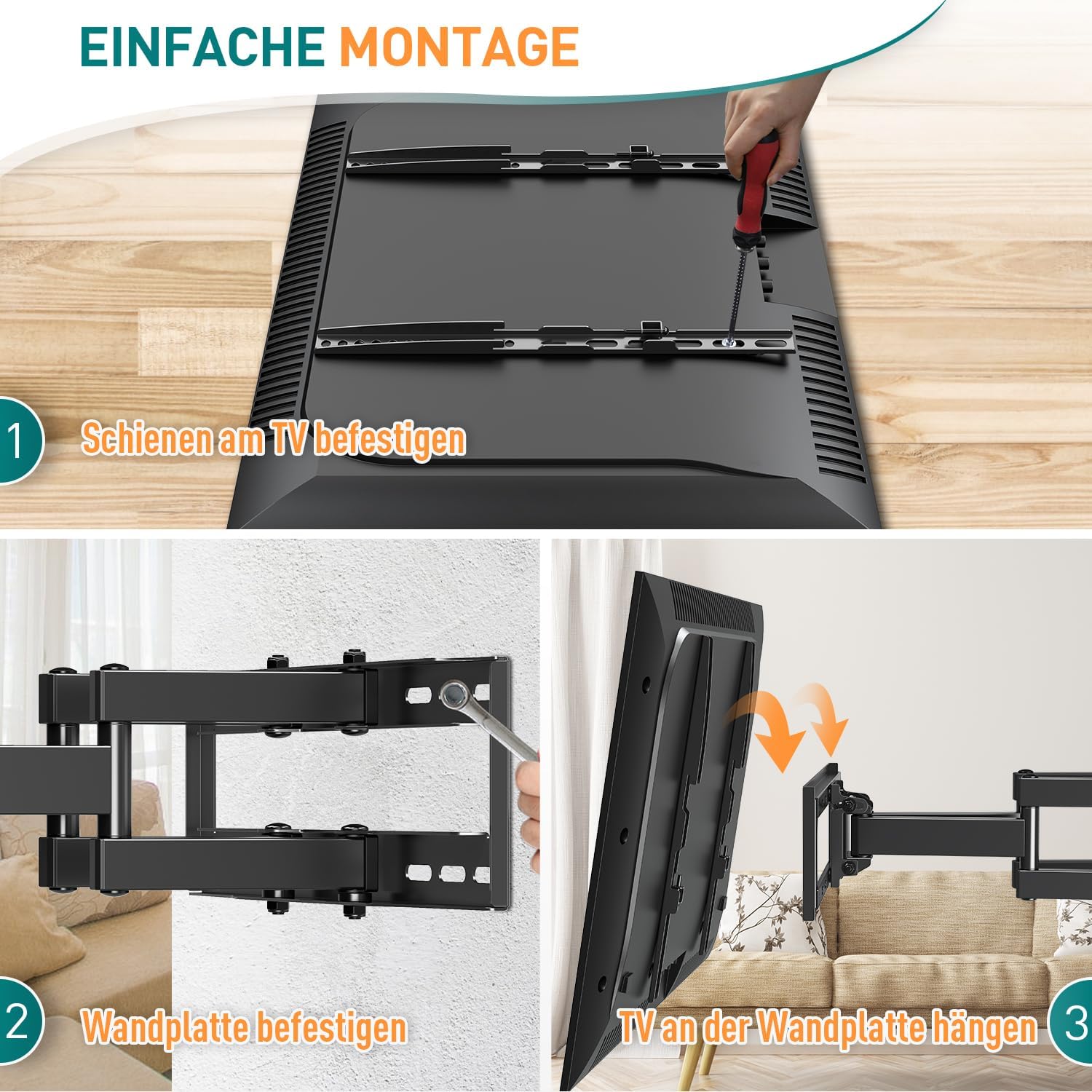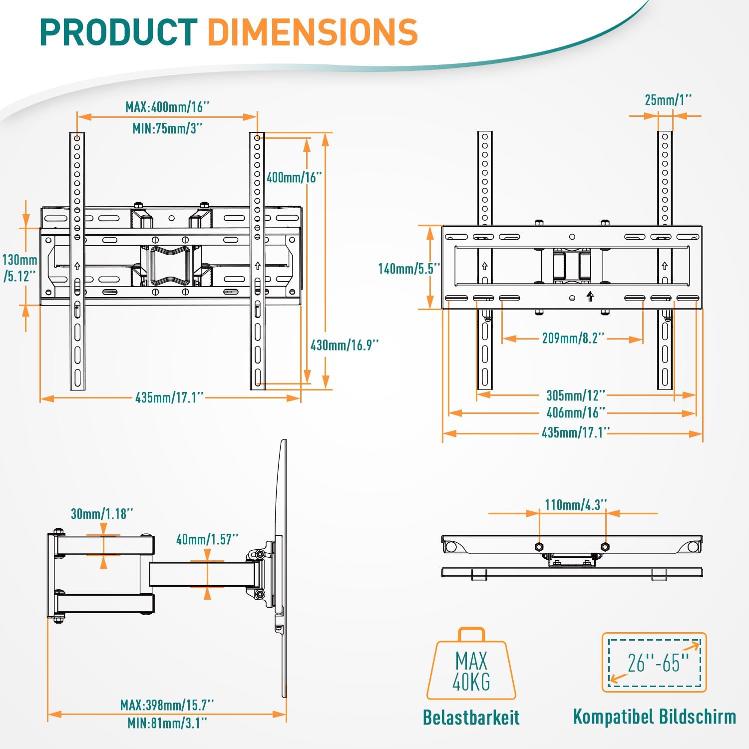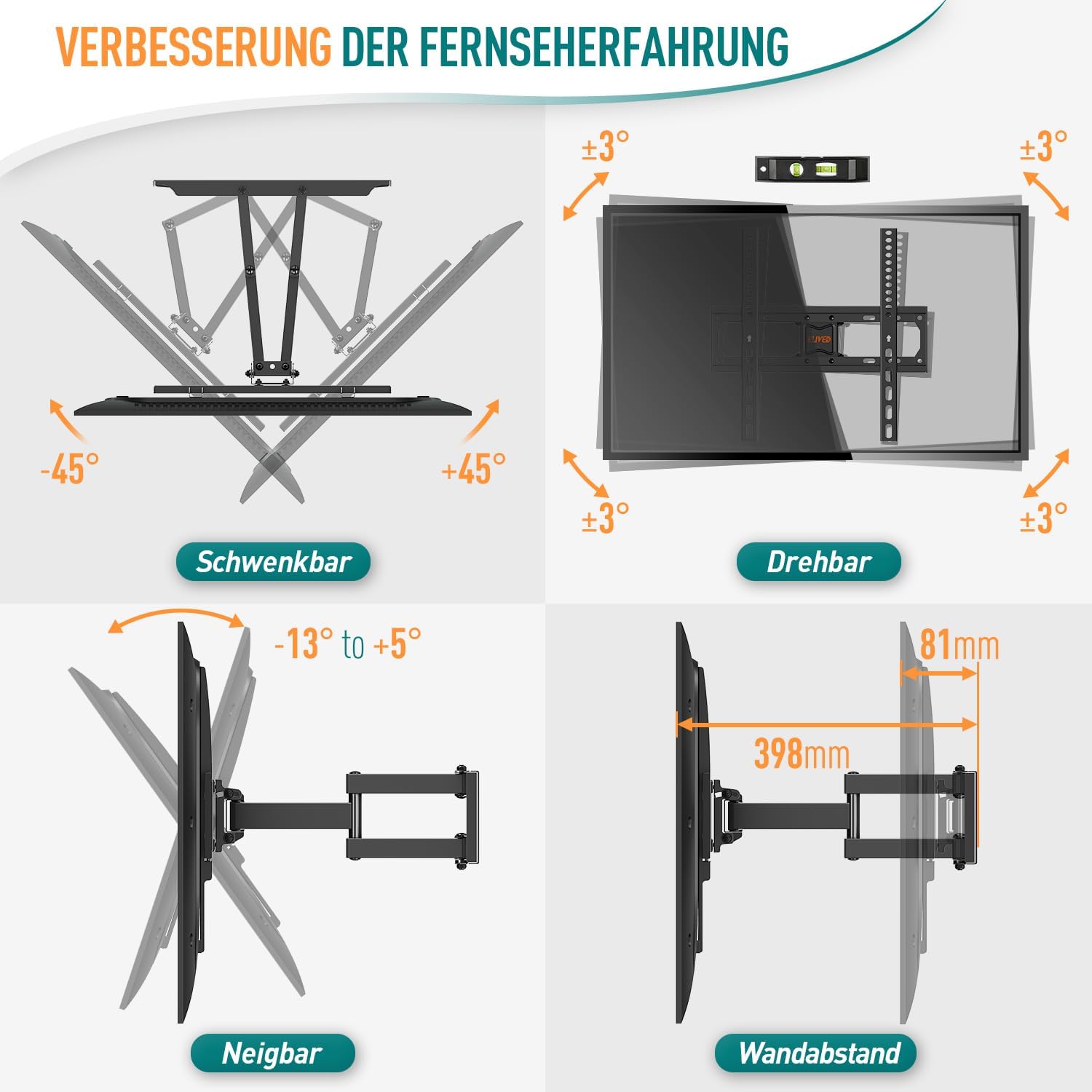 • Optimaler Blickwinkel - Diese Fernseher Halterung ist mit einer +5/-13° Neigung , einer +/-45° Schwenkbewegung und einer +/-3° Drehung ausgelegt. Der Fernseher kann auf 398mm herausgezogen und auf 76mm zurückgezogen werden.