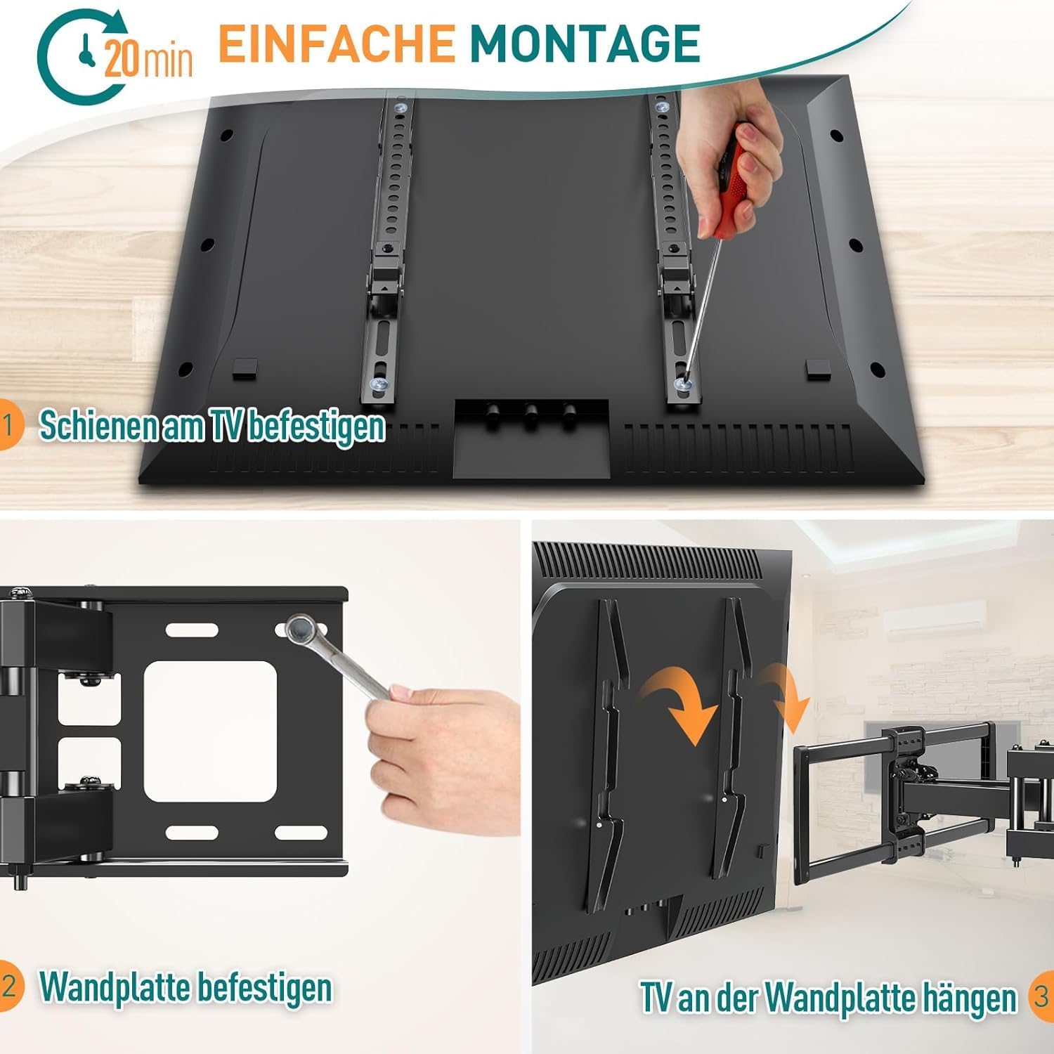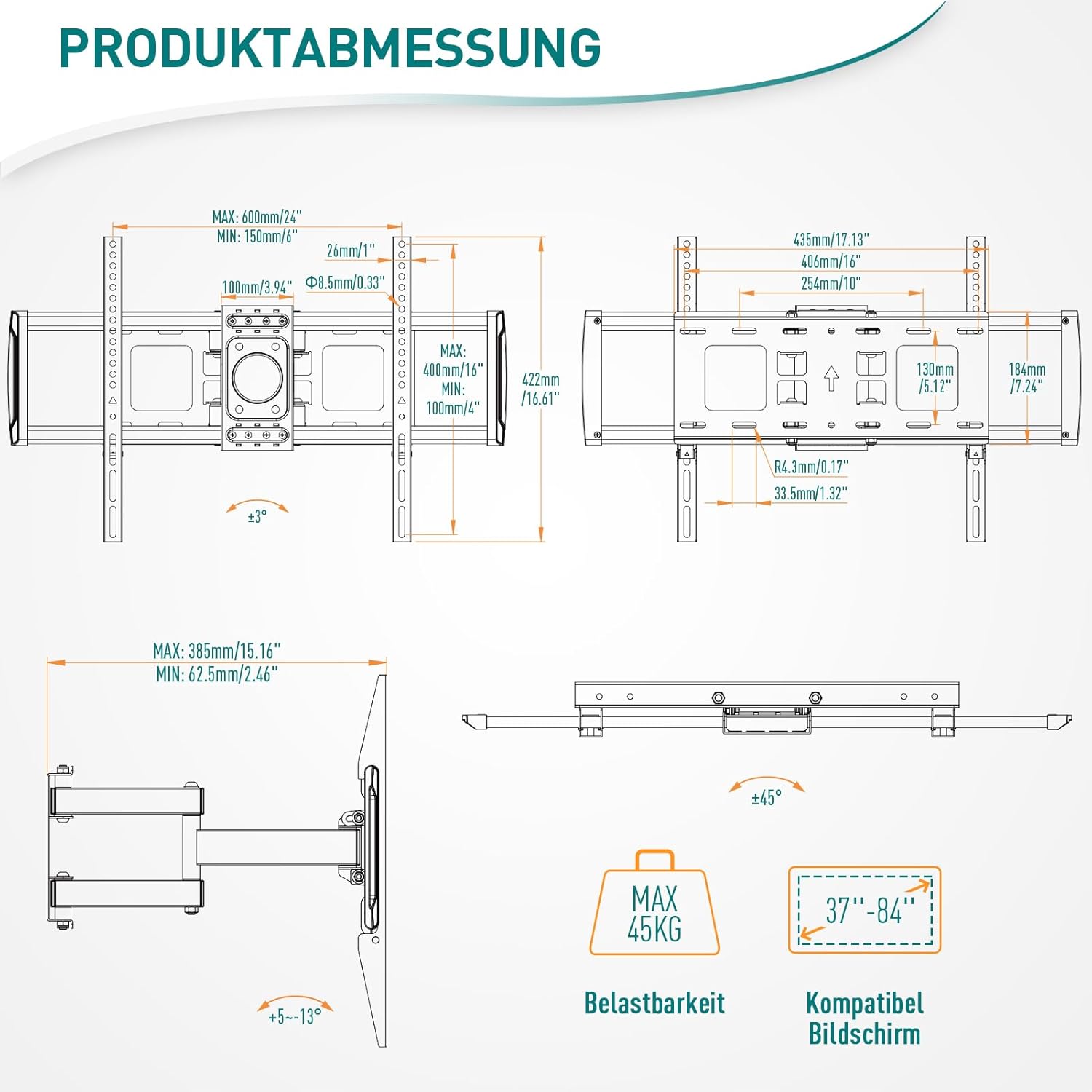 - Multifunktion - Diese Fernseher Halterung ist mit einer +5° bis -13°Neigung , einer +/-45°Schwenkbewegung und einer +/-3°Nivellierung ausgelegt. Der Fernseher kann auf 385mm herausgezogen und auf 62.5mm zurückgezogen werden.