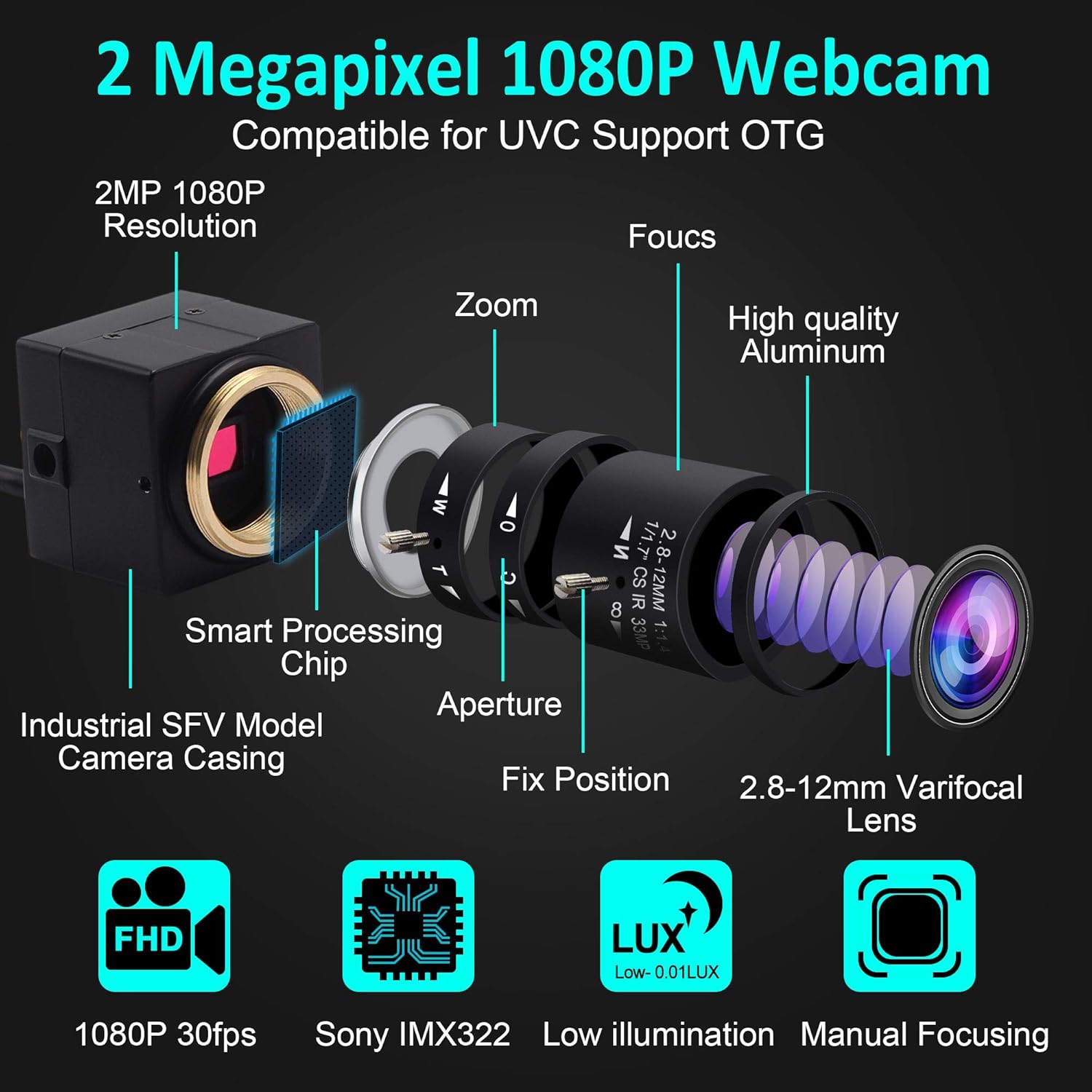 - USBFHD06H-SFV(2.8-12mm) 1080P Kamera USB HD 2.8-12mm Manual Zoom Varifocal Lens illumination Webcam mit 3M USB Kable