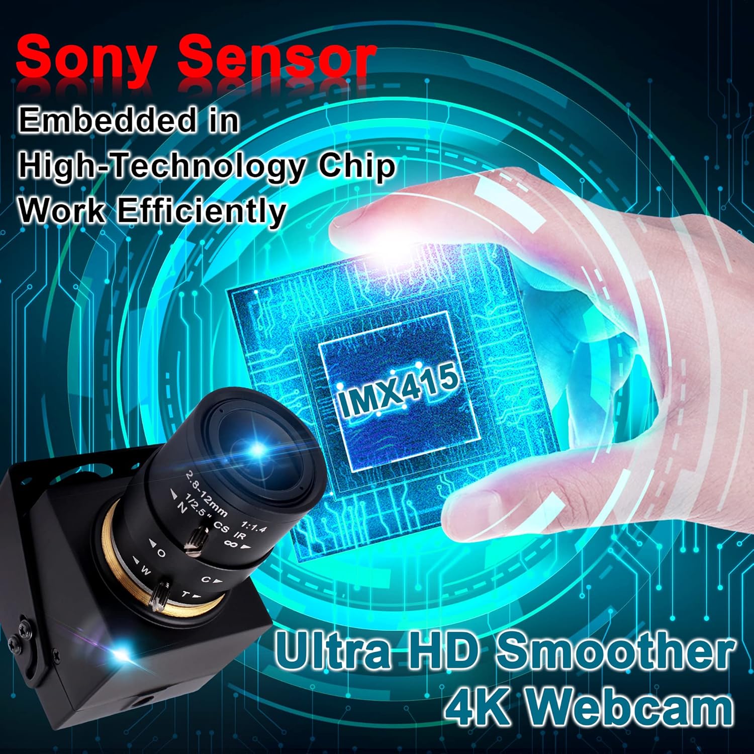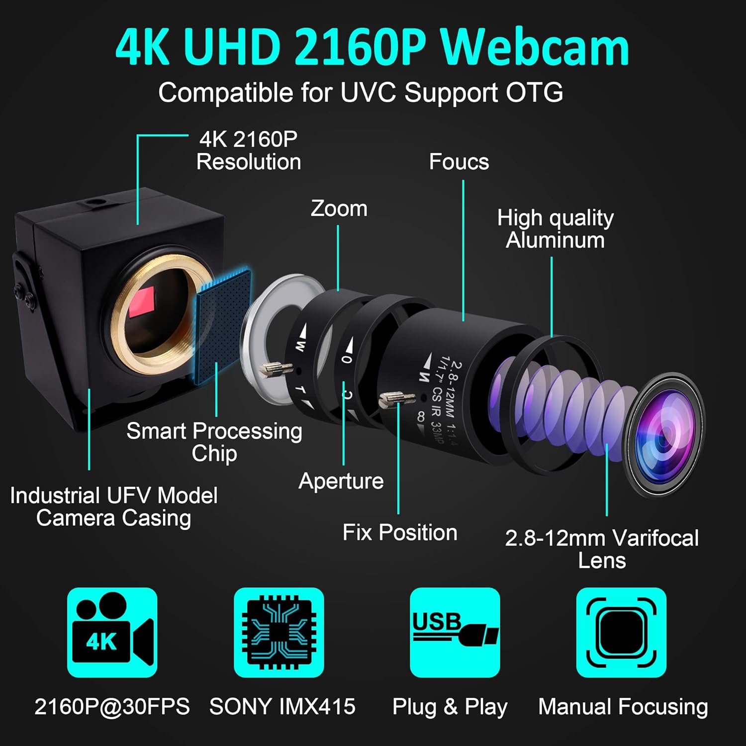 - 【4K Ultra HD Webcam】4k hochauflösende 2160P usb Kamera mit IMX415 Sensor.Hochwertiger Chip IMX415 Bildsensor liefert scharfe Videos und Bilder mit 30 Bildern pro Sekunde. PC-Webkamera unterstützt 3840x2160@30fps, USB2. 0 Plug and Play Webcam für