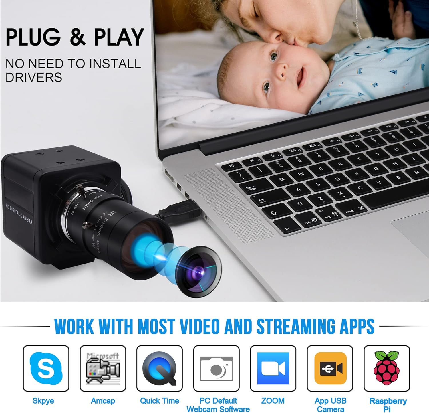- 【Breite Anwendung USB Kamera】5MP USB-Kamera mit Aluminium-Minikoffer,Plug&Play (UVC-konform),Unterstützung OTG optional,USB2.0 Webcam Komprimierungsformat: MJPEG / YUY2 Optional. Geeignet für die Verwendung in Projektanwendungen mit Himbeer-Pi oder
