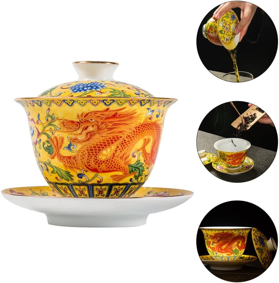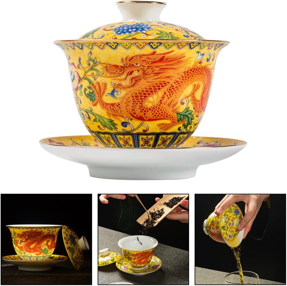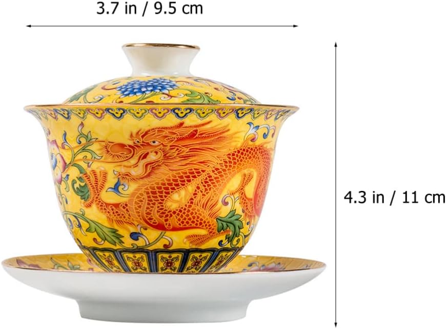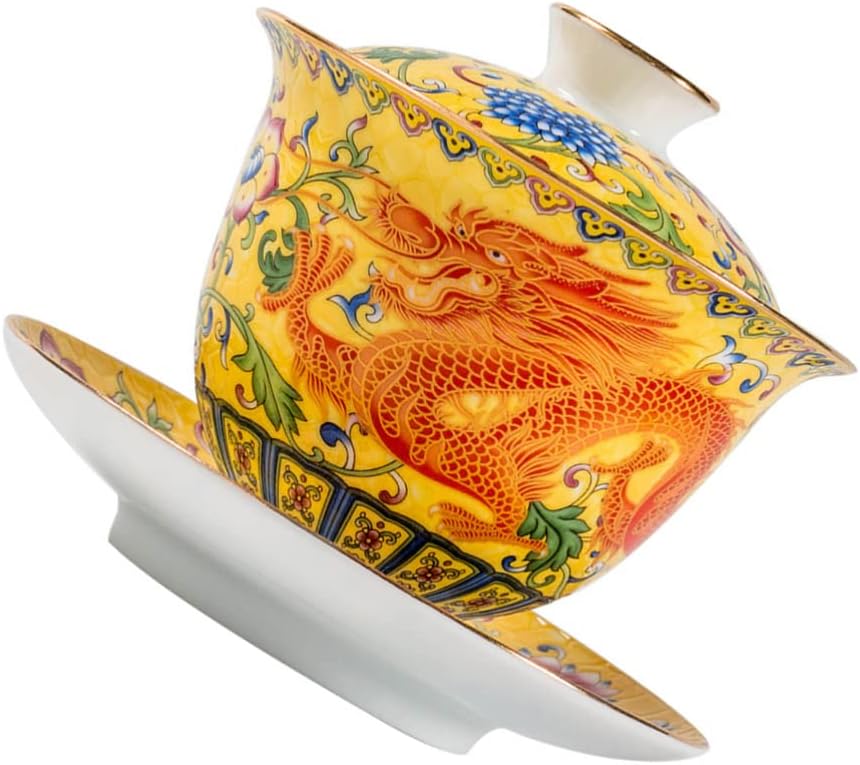 Emaille-Teetasse mit Deckel und Untertasse, Motiv: gelber Drache, traditionelles chinesisches Gaiwan