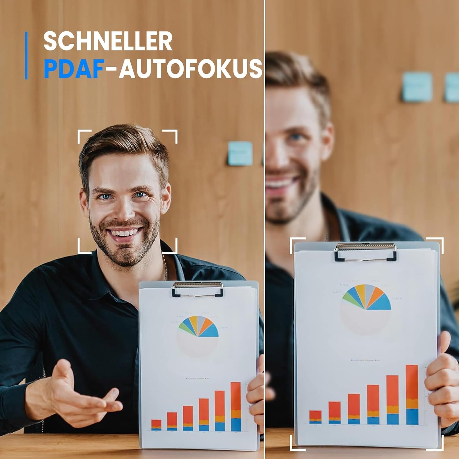 - Schneller und präziser Autofokus: Unsere Webcam nutzt die fortschrittliche PDAF-Technologie für einen schnellen und präzisen Autofokus, der sicherstellt, dass die web cam immer auf Sie fokussiert ist, egal wie die Licht- oder Umgebungsbedingungen
