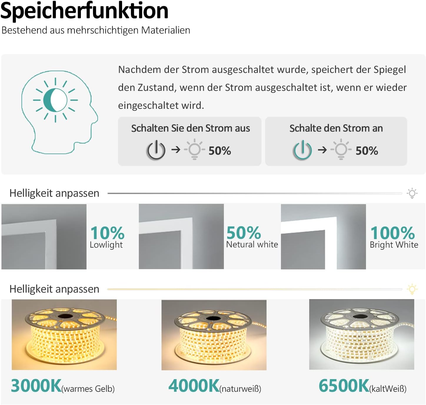 - 【3 Lichtfarben Dimmbar】Unser LED-Badspiegel verfügt über 3 Lichtfarben (Warmweiss/Kaltweiss/Neutralweiss), deren Helligkeit zwischen 10% und 100% eingestellt werden kann. Sie können die Lichtmodi des Badezimmerspiegels je nach Bedarf in