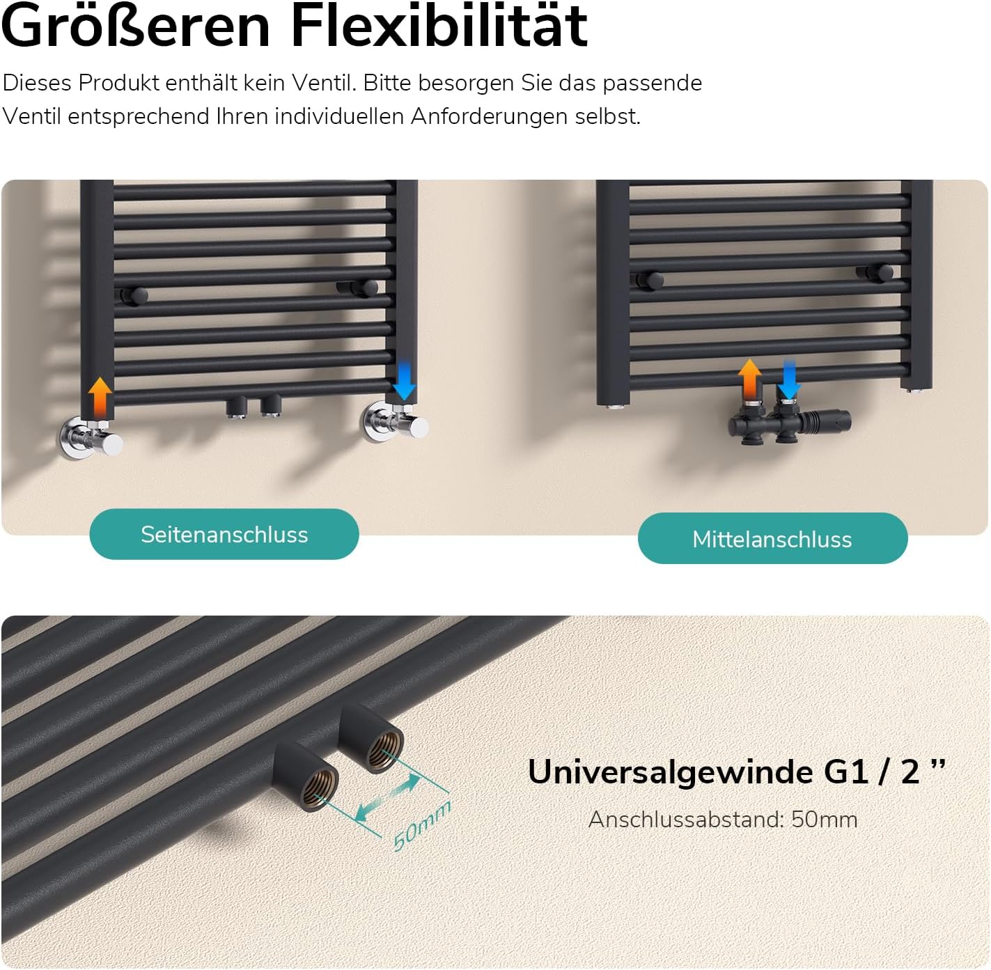 - Badheizkörper Anschluss: Mittelanschluss für Wasser (Gewinde: G1/2", Abstand: 50mm); Beide Enden des Heizkörpers können auch als Wasserein- und -auslass verwendet werden (mit geteilten Ventilen).