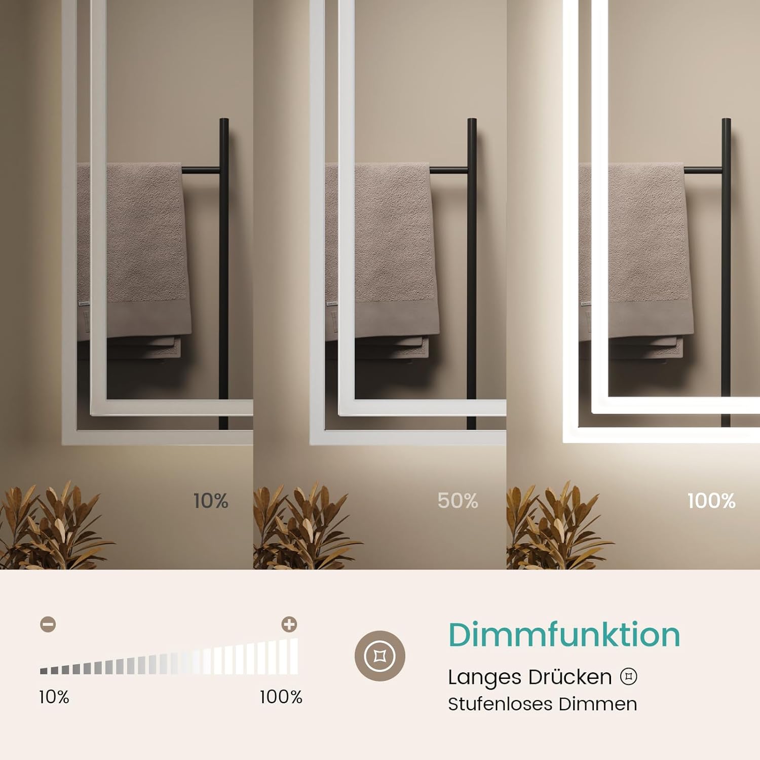 - 【Einstellbare Helligkeit】Drücken Sie lange auf die Spiegeltaste, um die Helligkeit einzustellen. Der LED Badspiegel mit Beleuchtung verfügt über eine Speicherfunktion, um sich die letzte Einstellung des Spiegels zu merken, was sehr praktisch ist.