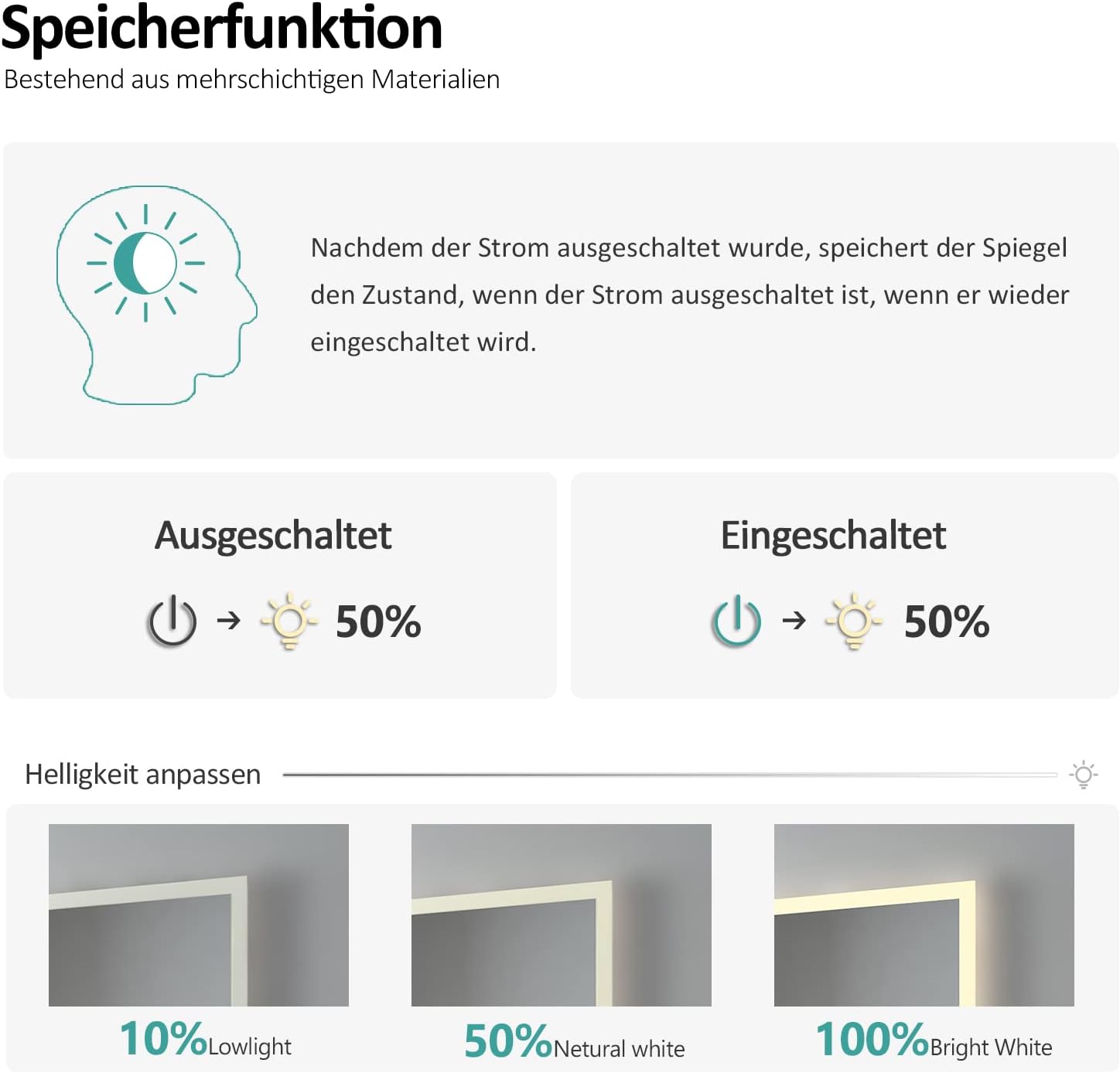- đĄă5mm umweltfreundlicher kupferăBleifreier Spiegel mit hochwertigem Kantenschliff: bessere KorrosionsbestĂ€ndigkeit und höhere Reflexion als ein normaler Silberspiegel. LED Badspiegel Umgeben von LichtbĂ€ndern ist das Licht hell ohne Schatten.