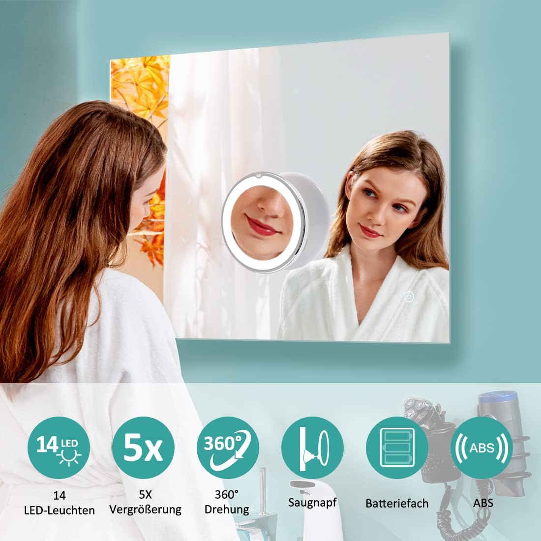 - 【5 Fach Vergrösserung】Der Schminkspiegel mit beleuchtung aus hochwertigem Materialien, Vergrösserung ist bis zu 5-fach. Perfekt für Rasieren, Haarstyling und Gesichtspflege.