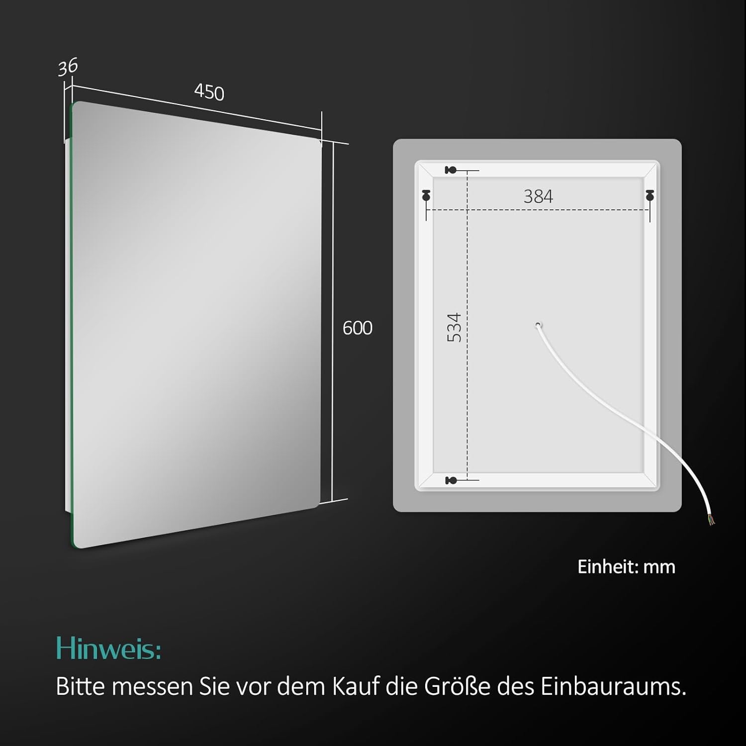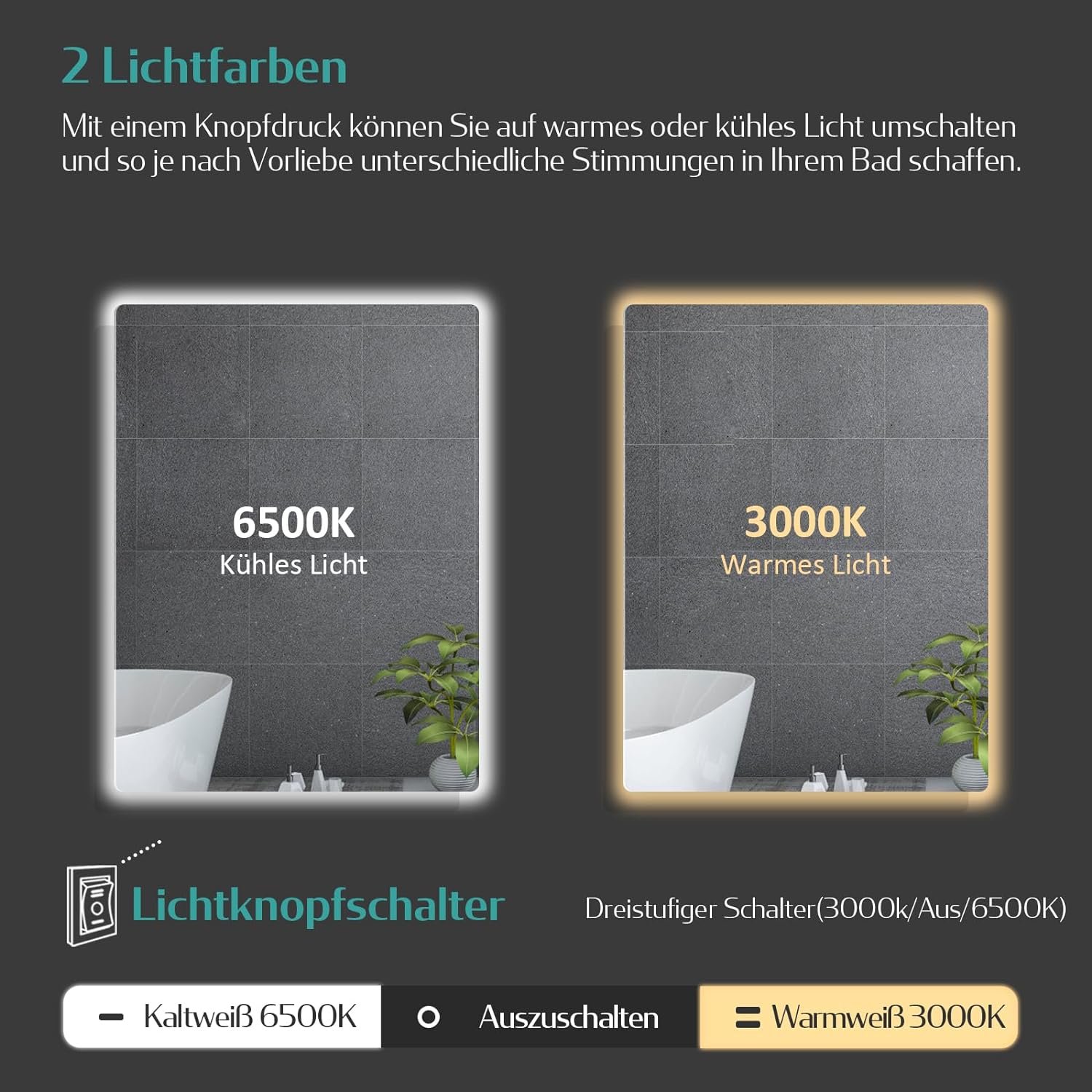 • 【LED Badspiegel】Hinterleuchtet Spiegel 40x60/60x40cm, kann horizontal oder vertikal aufgehängt werden. Mit Knopfschalter, 2 Lichtfarben Warmweiss/Kaltweiss, separater Anti-Beschlag-Taste, energiesparend und IP44 wasserdicht.