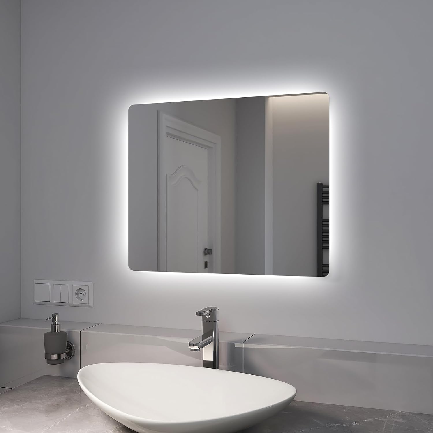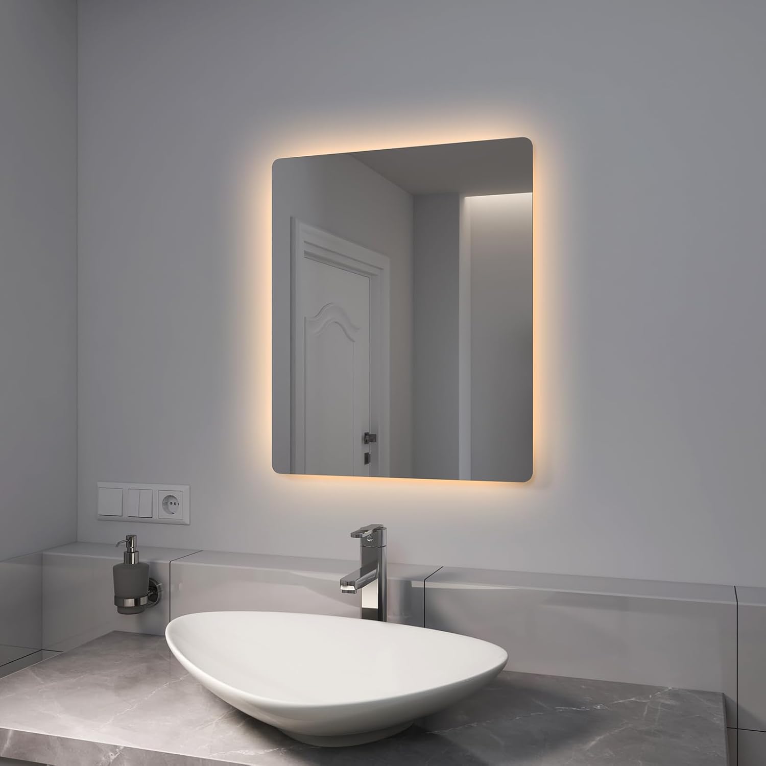 - 【LED Badspiegel】Hinterleuchtet Spiegel 50x60/60x50cm, kann horizontal oder vertikal aufgehängt werden. Mit Knopfschalter, 2 Lichtfarben Warmweiss/Kaltweiss, separater Anti-Beschlag-Taste, energiesparend und IP44 wasserdicht.