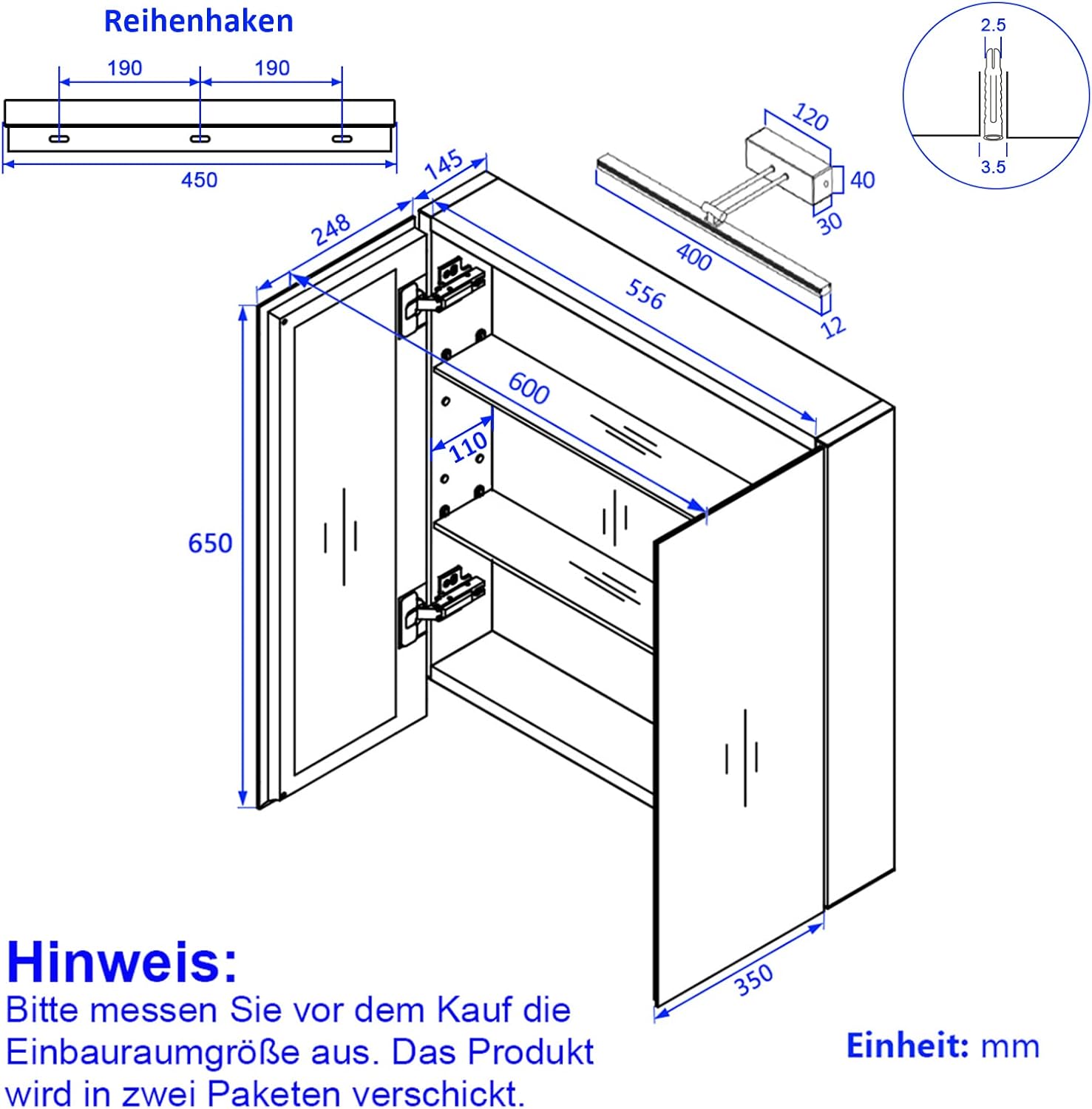 - 【Spiegelschränke Grösse】60x65x14cm (WxHxT), Matt-weiss Fertig, Doppelseitiger Spiegel. Die Tür des LED Spiegelschranks lässt sich bis zu 105 Grad öffnen.
