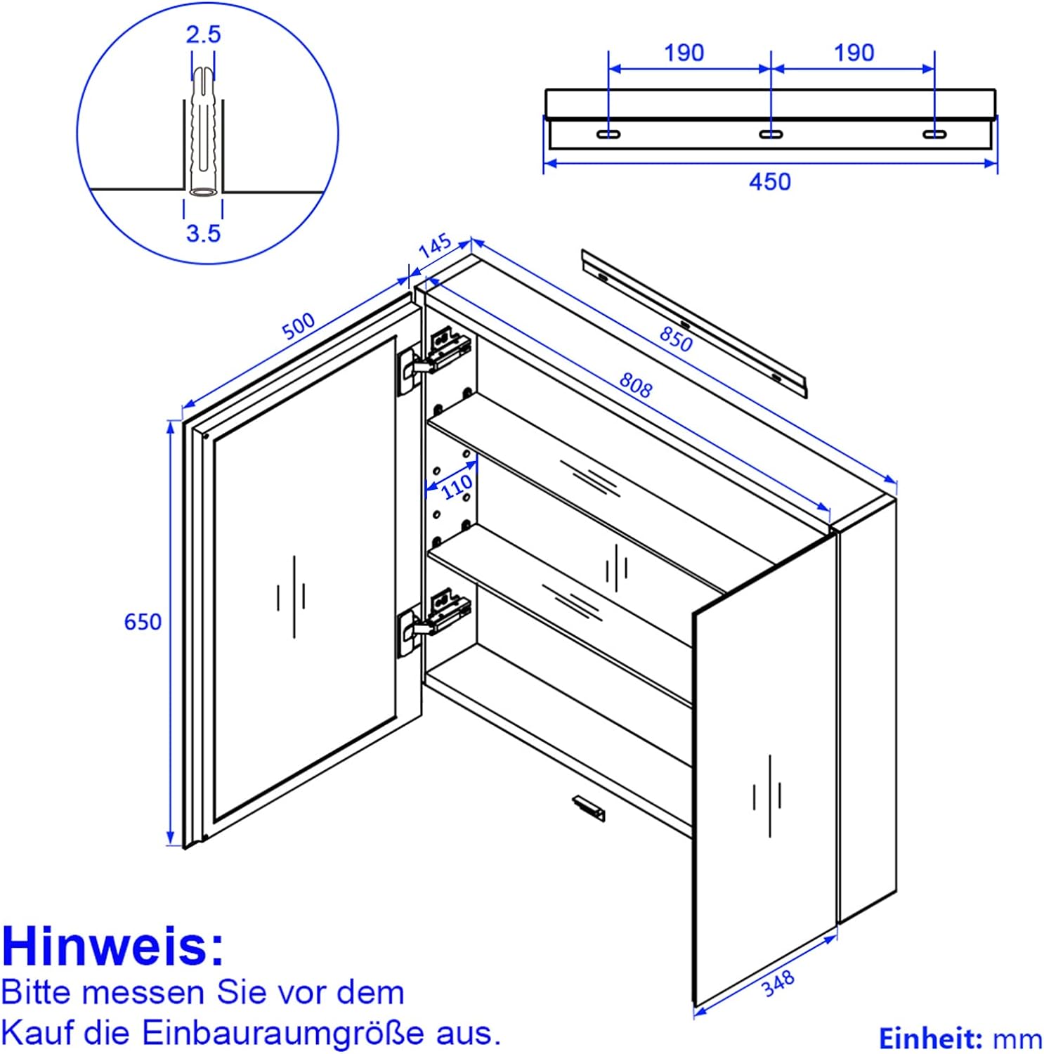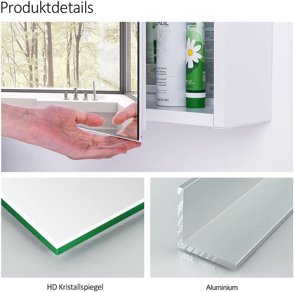 - 【Umweltfreundliche Materialien】Spiegel ohne Kupfer und Quecksilber. Der Gehäusekörper besteht aus einem 1,0-1,2 mm dicken pulverbeschichteten Aluminiumprofil und der Spiegeltürrahmen besteht aus ABS-Thermopolymer weshlab er robust und stabil ist.