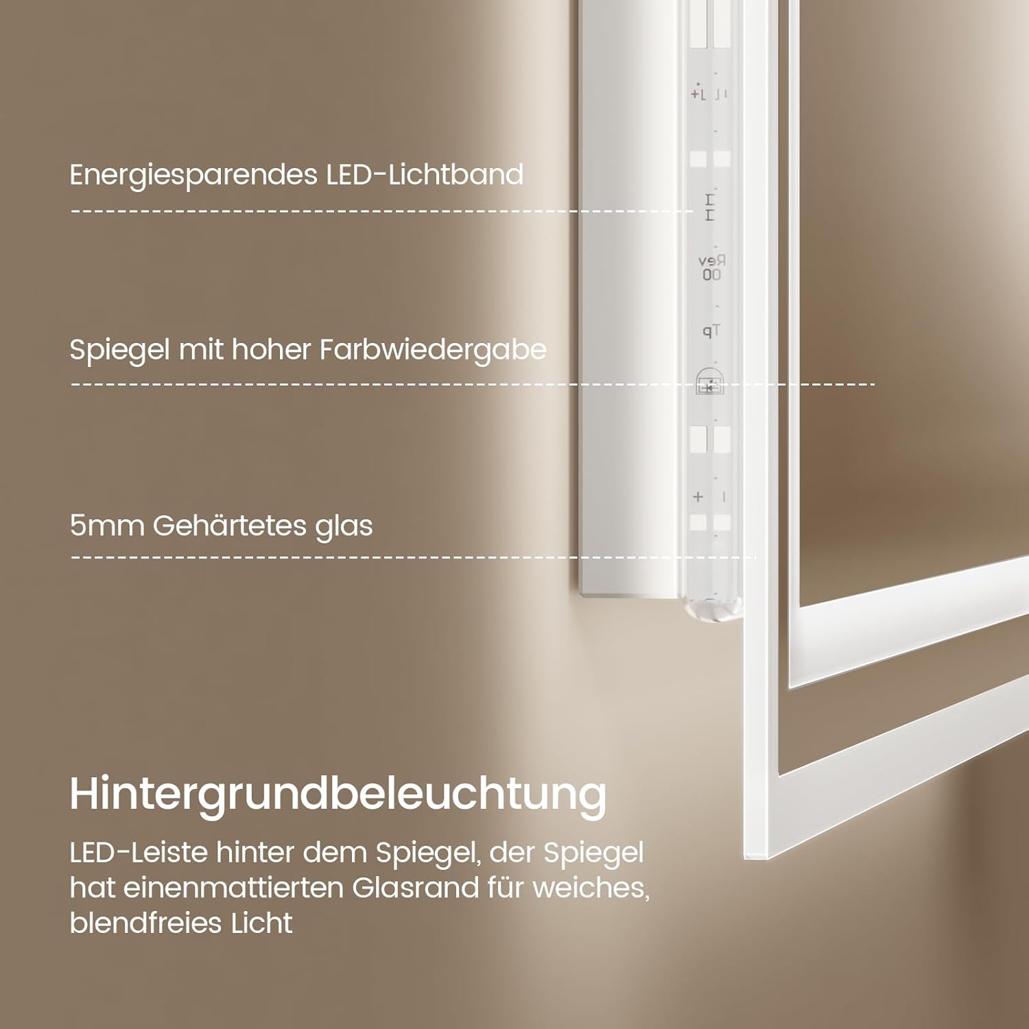 - 【Energiesparende LED】 Einem niedrigen Stromverbrauch erfreuen Sie sich, Sehr hochwertiges und wasserdichtes Niveau (IP 44), LED Lebensdauer 50.000 Stunden, Kupfer- & bleifreier Spiegel mit hochwertigem Kantenschliff, rostbeständiger Aluminiumrahmen