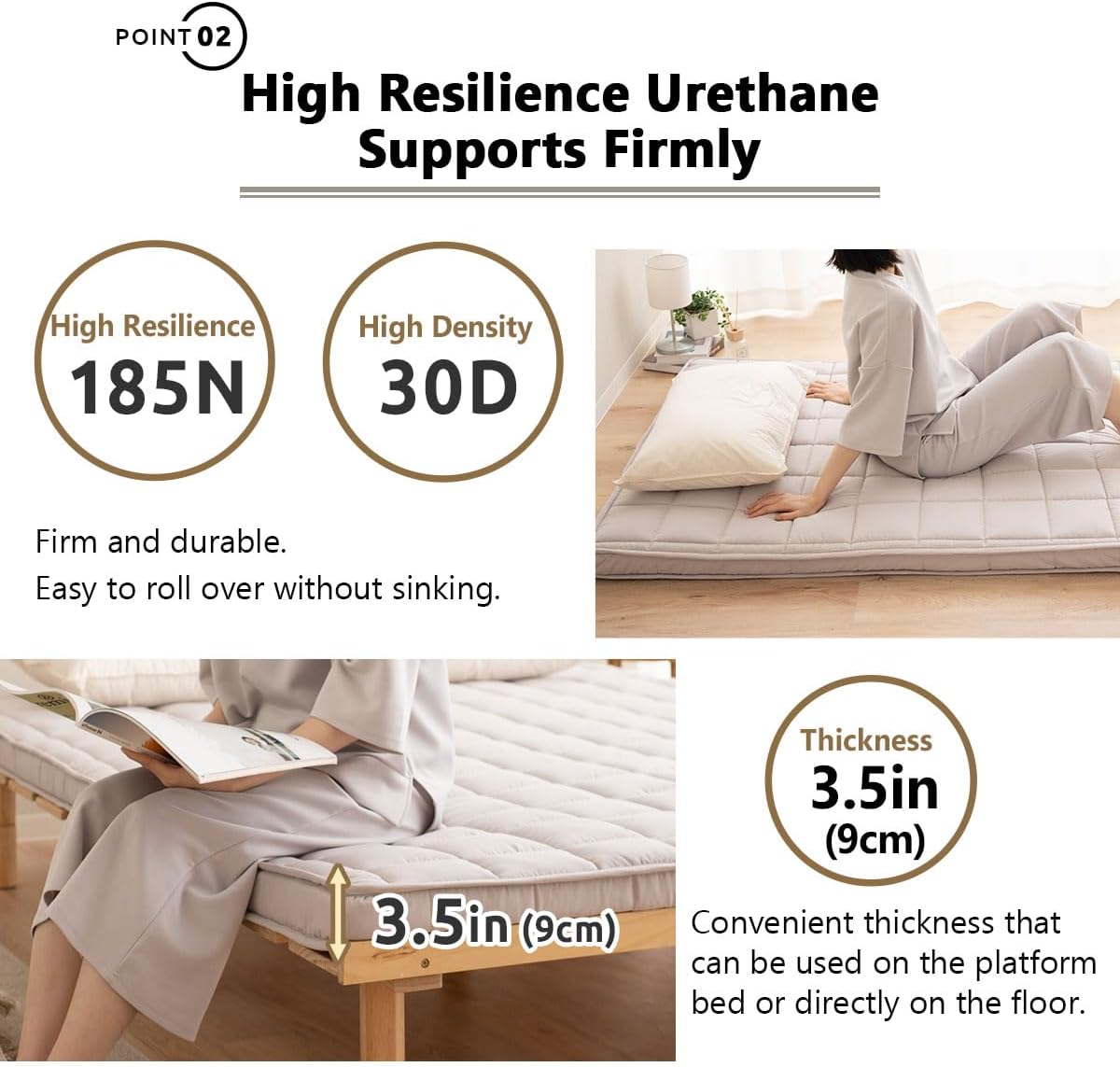 - [ZWICKEL-FUTON] Dank eines Zwickels ändert sich die Dicke bis zum Rand nicht. Der gleiche Komfort, egal wo Sie schlafen. Die Dicke von 9cm (3in) eignet sich sowohl für die Verwendung auf dem Plattformbett als auch direkt auf dem Boden.