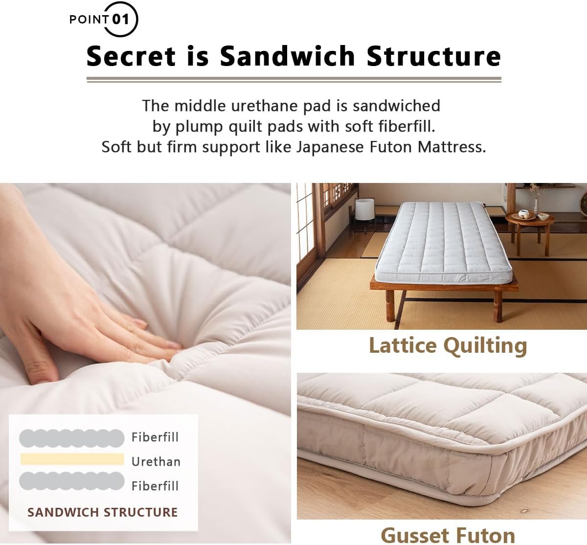 - [SANDWICH-STRUKTUR] Die mittlere Urethan-Unterlage ist von dicken Steppdecken mit weicher Faserfüllung umgeben. Weiche, aber feste Unterstützung wie traditionelle japanische Futonmatratzen. Verwendetes hochelastisches 185N und hochdichtes 30D-Urethan,