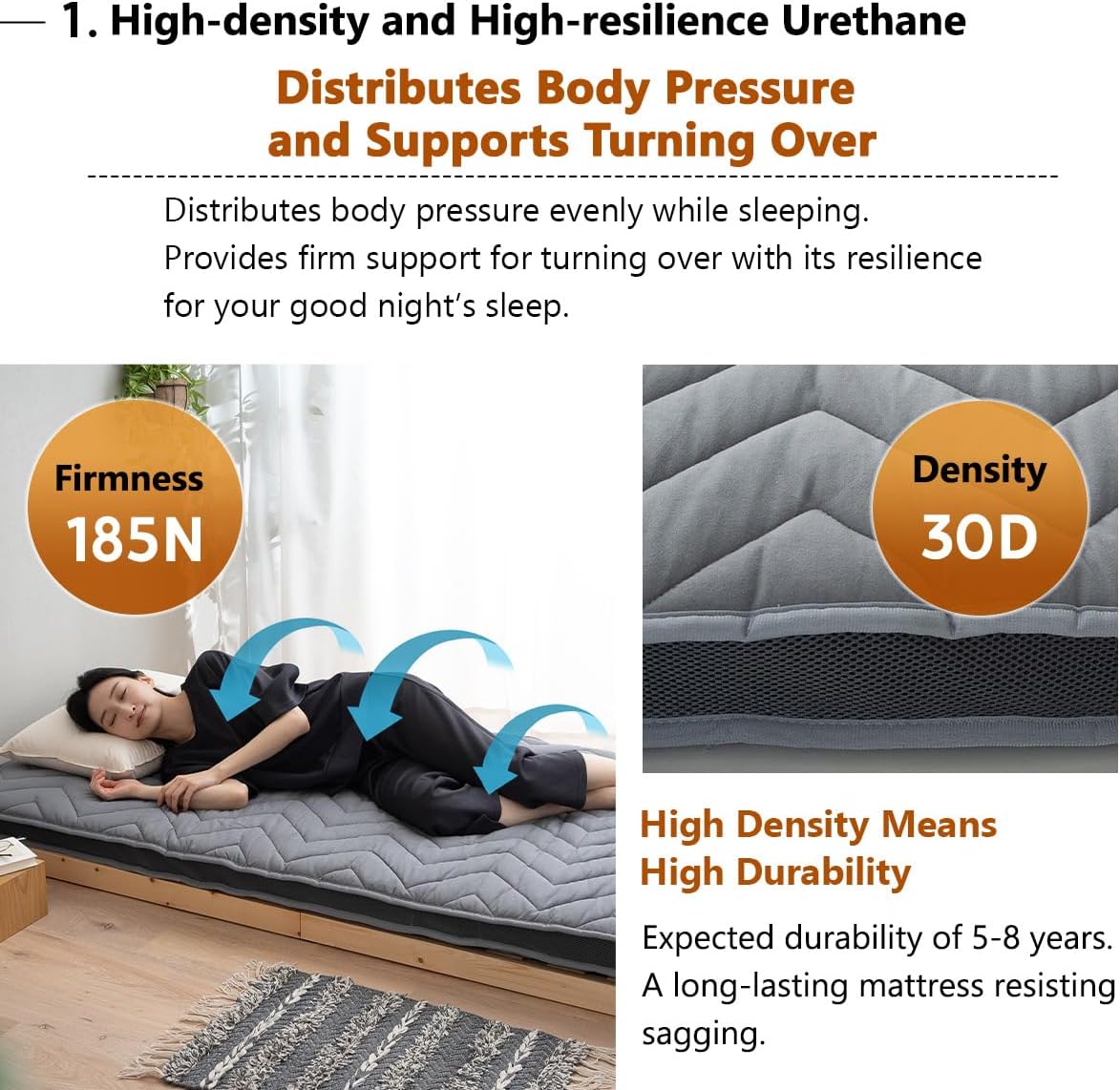 - [FUTON MIT ZWEIFACH] Dank eines Zwickels ändert sich die Dicke bis zum Rand nicht. Der gleiche Komfort, egal wo Sie schlafen. 9 cm (3 Zoll) Dicke ist praktisch für die Verwendung sowohl auf dem Plattformbett als auch direkt auf dem Boden.