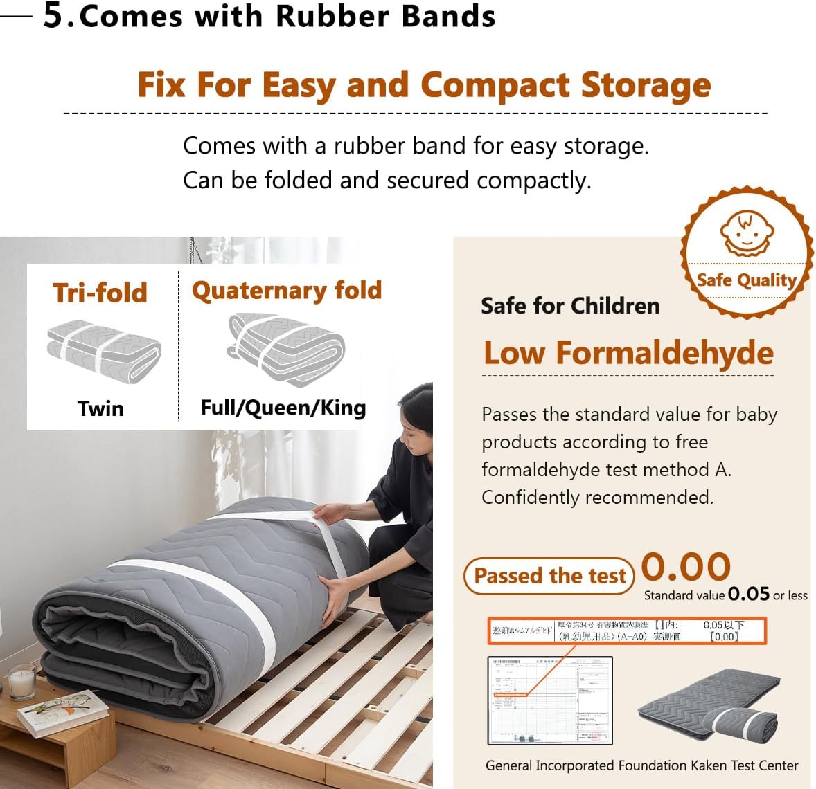 - [FALTBAR, LAGERBAR UND KOMFORTABEL] Geniessen Sie bequemen Schlaf auf einer flachen Oberfläche ohne Falten wie bei normalen 3-fach faltbaren Urethan-Matratzen. Und sparen Sie Platz mit den mitgelieferten Gummibändern zur Aufbewahrung.
