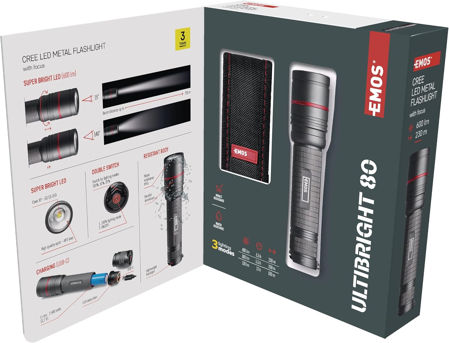 - KRAFTVOLLE HELLIGKEIT: Wasserbeständige und fokussierbare Taschenlampe Ultibright 80 mit 3 Beleuchtungsmodi (Hoch | Mittel | Niedrig). Diese robuste Leuchte erzeugt einen Lichtstrahl von max. 600 Lumen mit Reichweite bis zu 230 Meter.