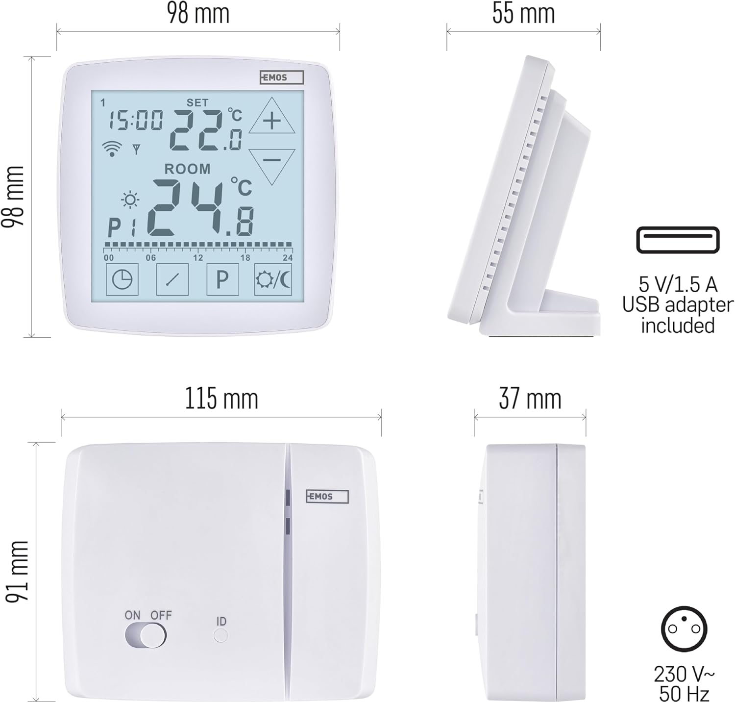 - PROGRAMMIERBAR: Temperatureinstellung von 7–30 °C in 0,2 °C Schritten. Verzögerung der eingestellten Temperatur (Hysterese): 0,1 -1,0 °C in 0,1 °C Schritten. Stromversorgung des Empfängers 230 V; des Senders 5V via 1,5m Kabel mit USB-Adapter