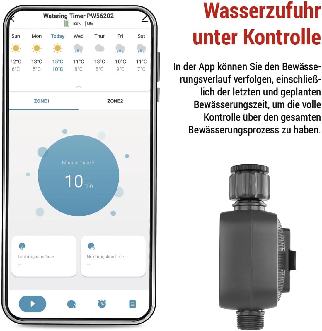• HANDY-GESTEUERTE BEWÄSSERUNG: Verfolgen Sie in der App den Bewässerungsverlauf oder unterbrechen Sie bei Regenwetter die geplante Bewässerung für 24, 48 oder 72 Stunden, um die volle Kontrolle über den Wasserverbrauch und Bewässerungprozess zu haben