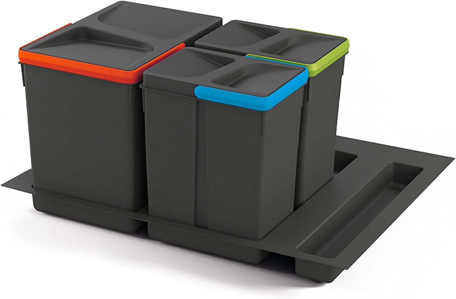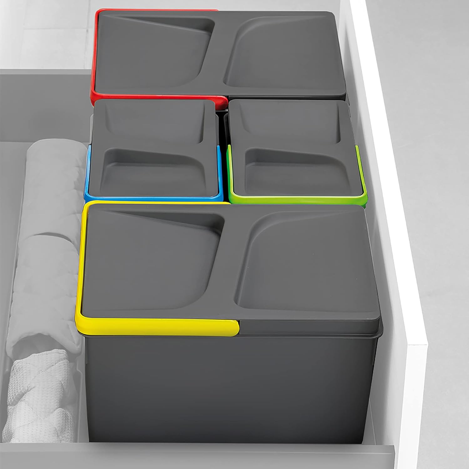 - Die Eimer verfügen über farbige Griffe, um die Mülltrennung sowie das Entnehmen zum Leeren und Reinigen zu erleichtern.