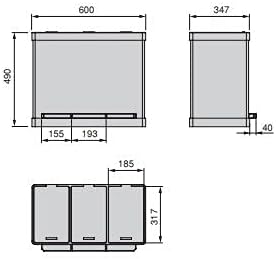 - Abmessungen: 60 cm lang x 34,5 cm breit x 49 cm hoch. Um den Beutel an die quadratische Bauform des Behälters anzupassen, wird empfohlen, einen Beutel mit einem grösseren Fassungsvermögen als dem für den Behälter angegebenen Volumen zu verwenden.