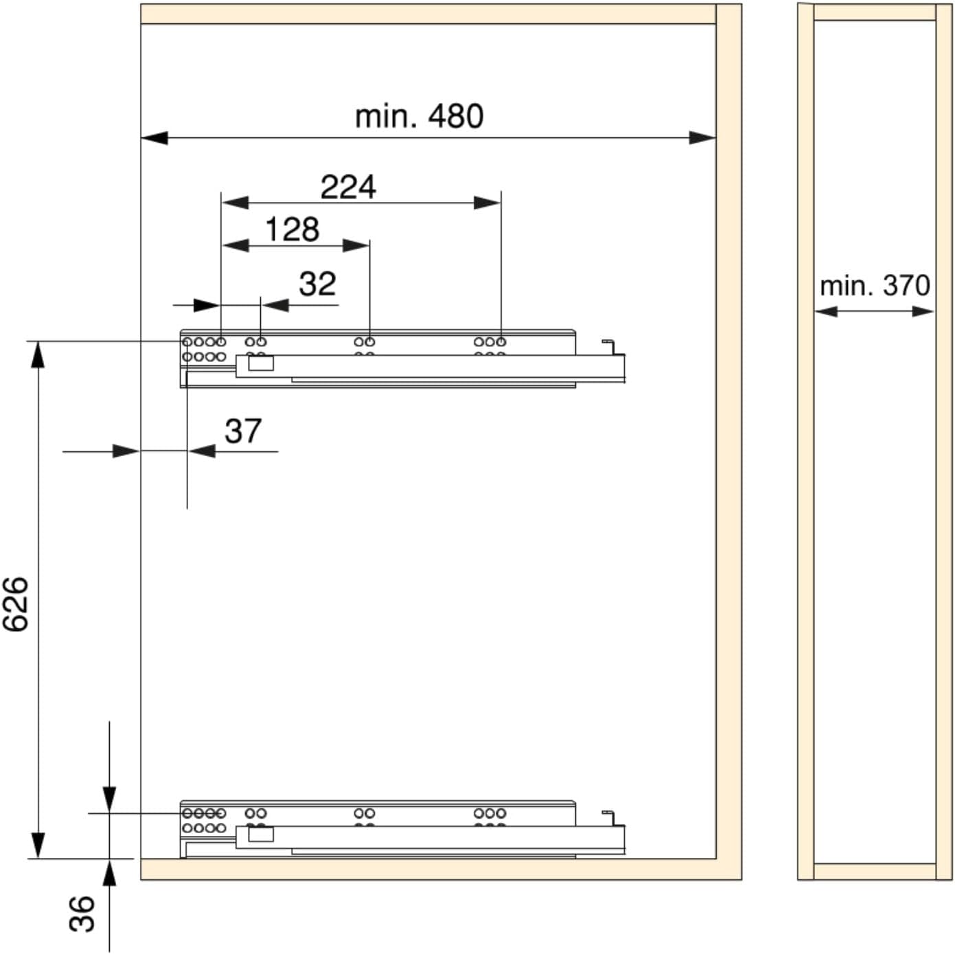 • Gültig für Module ab einer Mindestinnenbreite von 400 und einer Mindesttiefe von 480 mm.