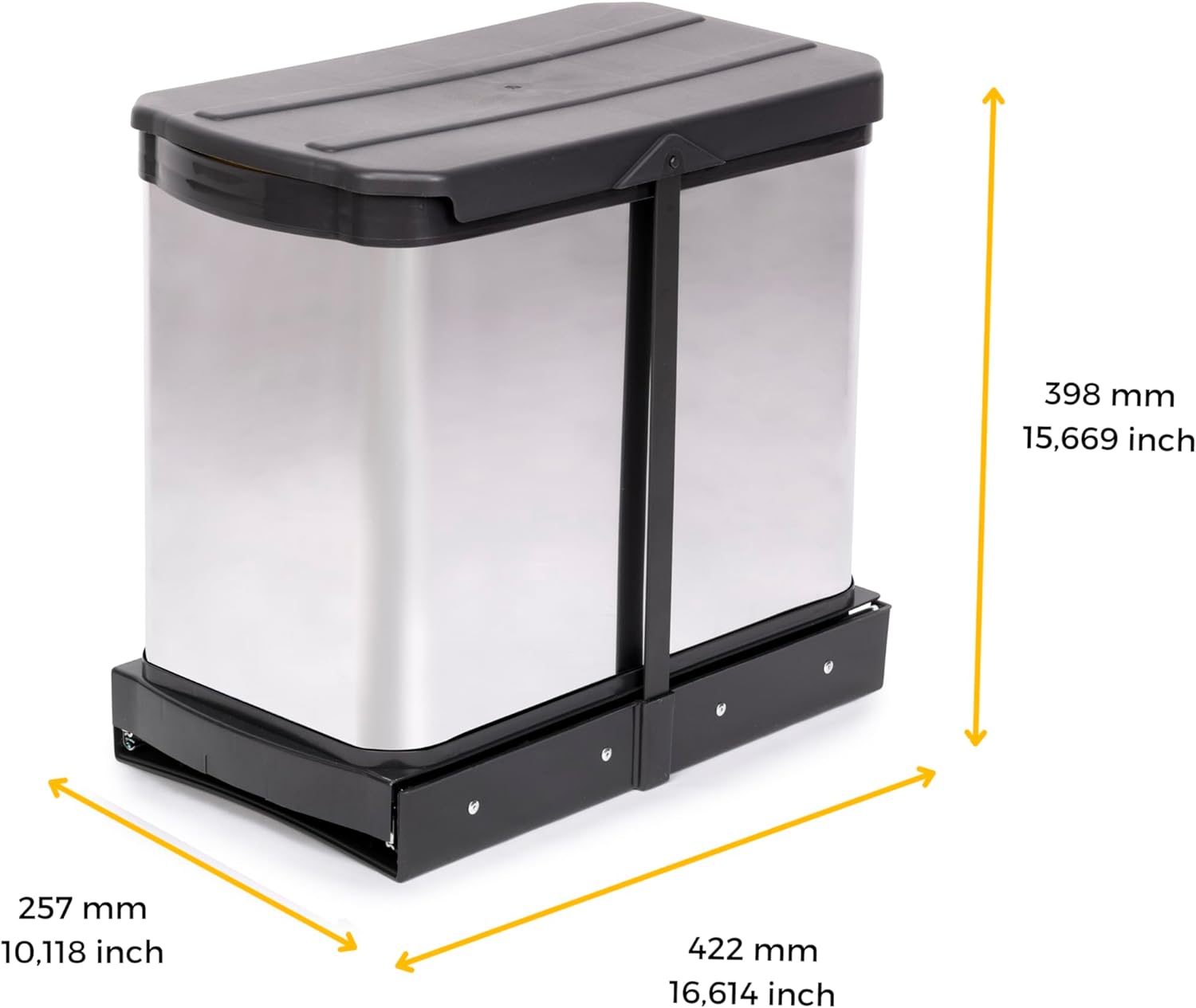- Es besteht aus Stahl und Kunststoff in einem anthrazitgrauen Finish. Es verfügt über zwei durch ein Edelstahlgehäuse geschützte Mülleimer mit einem Fassungsvermögen von jeweils 12 Litern und einem einfachen Griff zur Erleichterung der Entnahme.