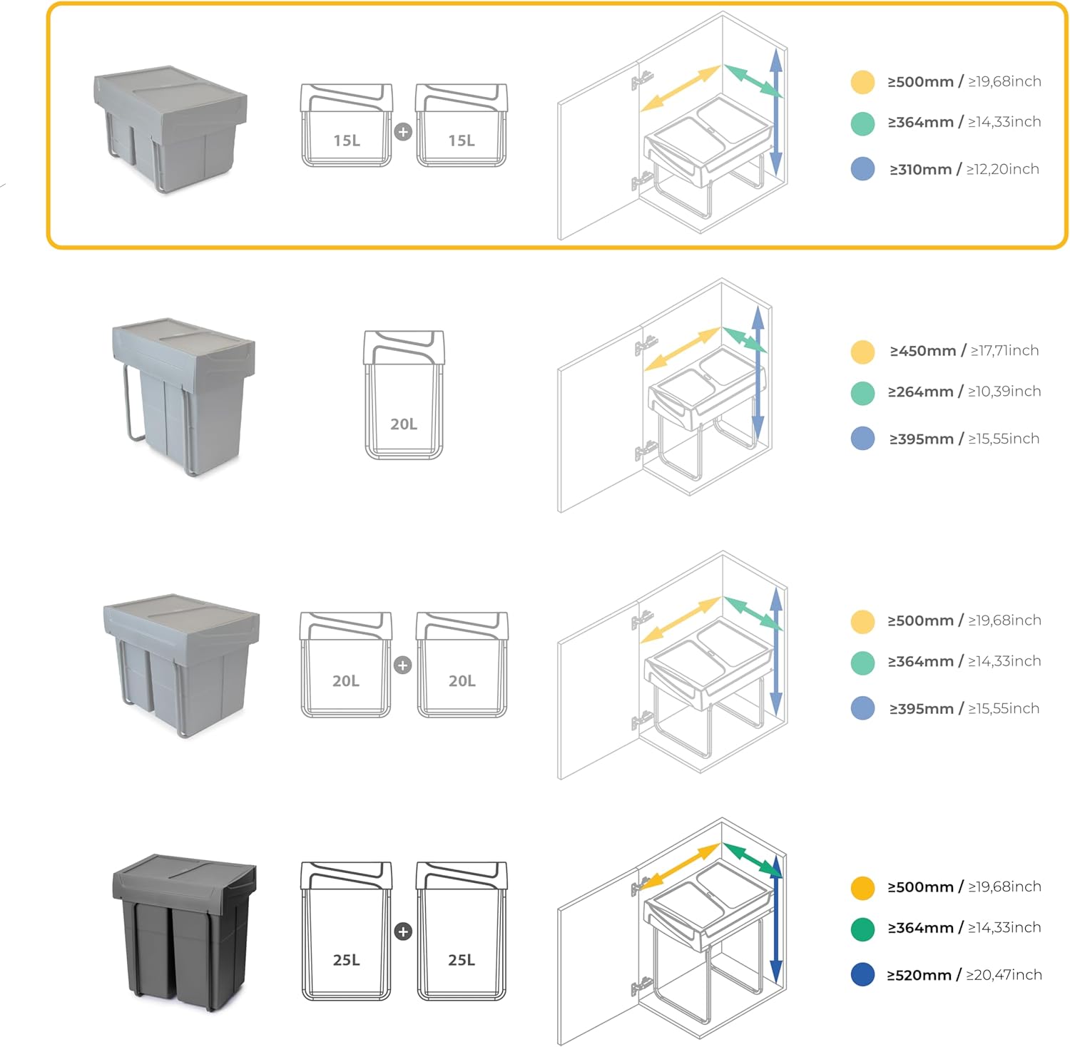 - Enthält zwei herausnehmbaren 15-Liter-Behälter. Völladig abnehmbare Kugelführungen, geräuschlos mit Gummihalter am Verschluss.
