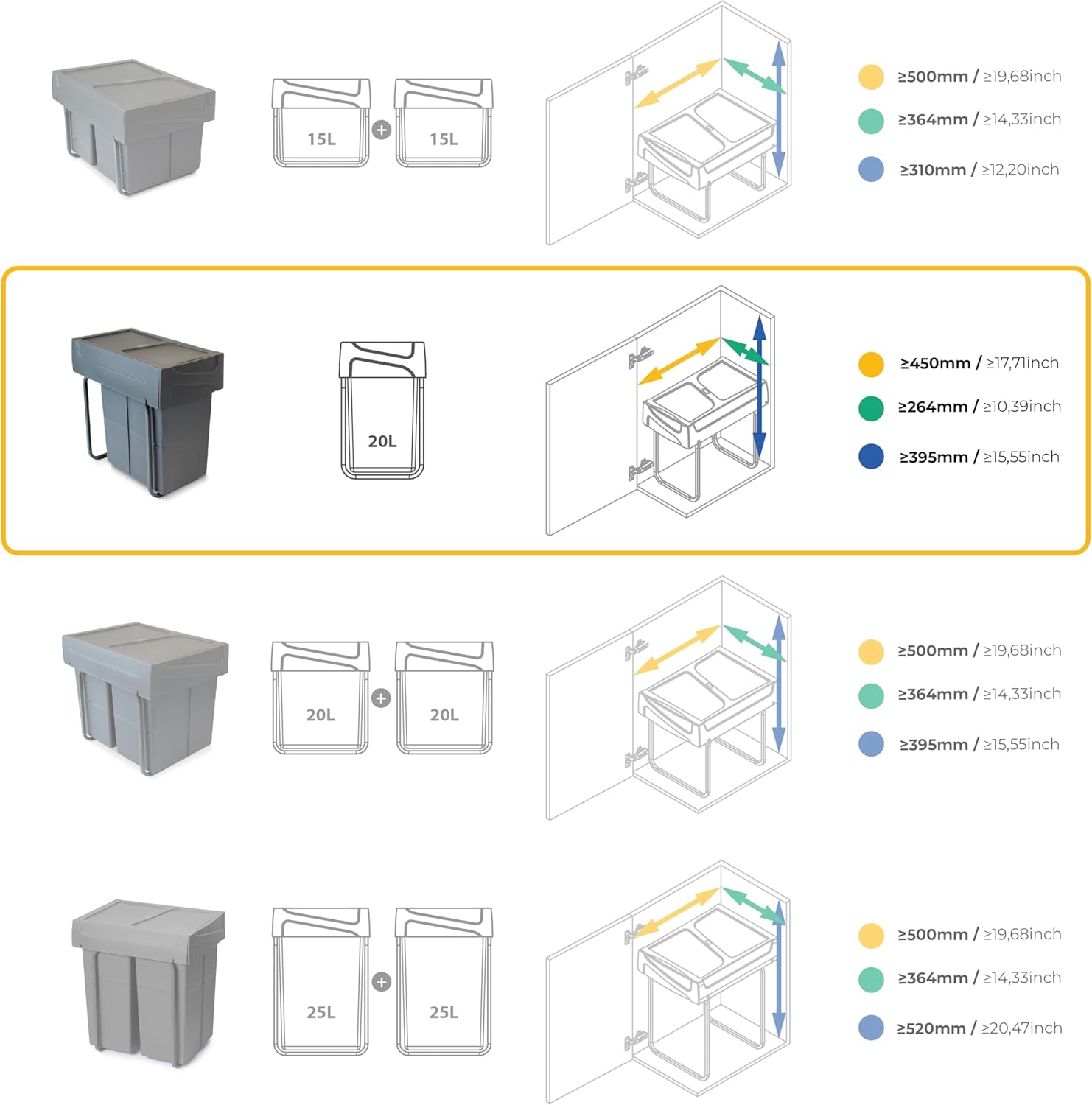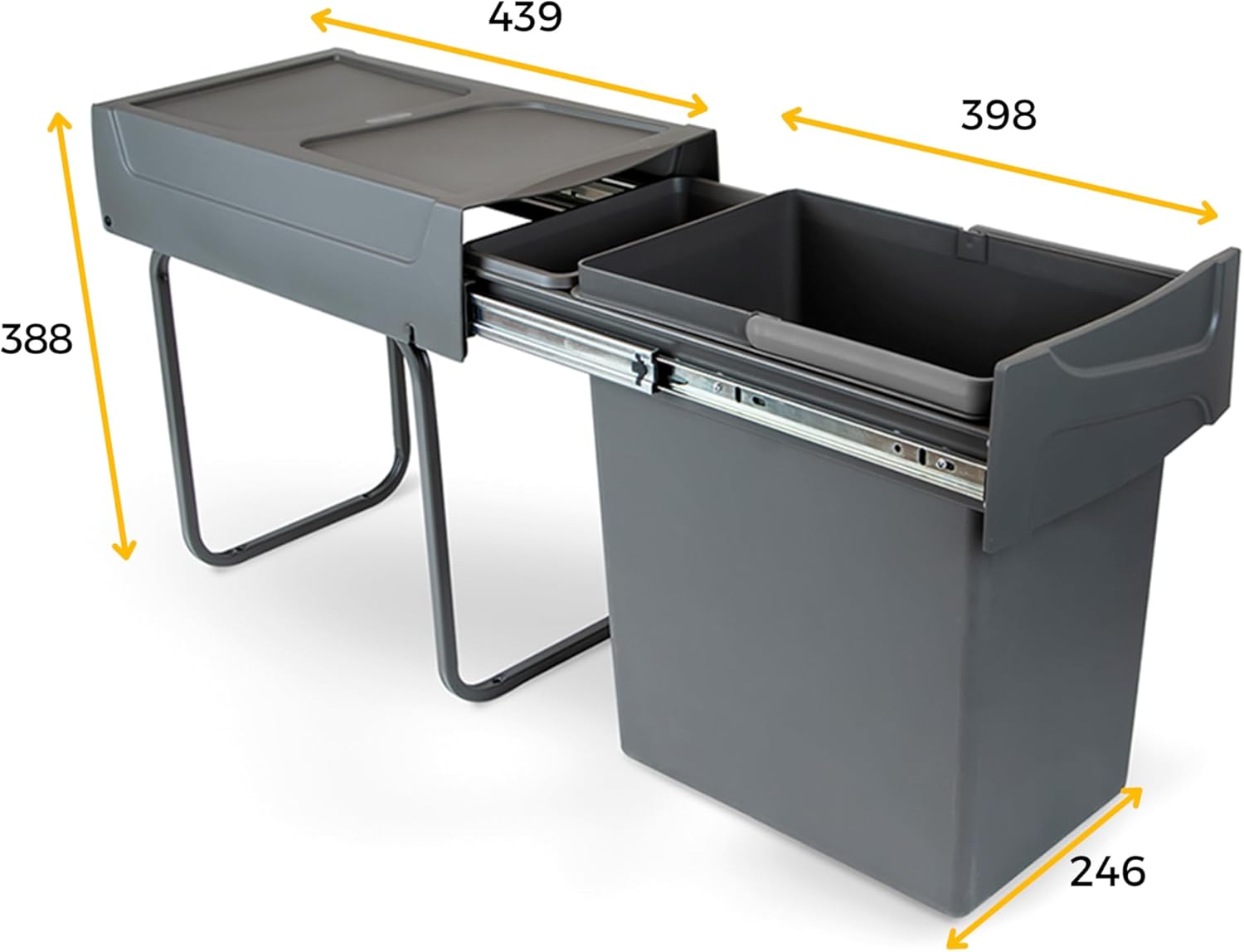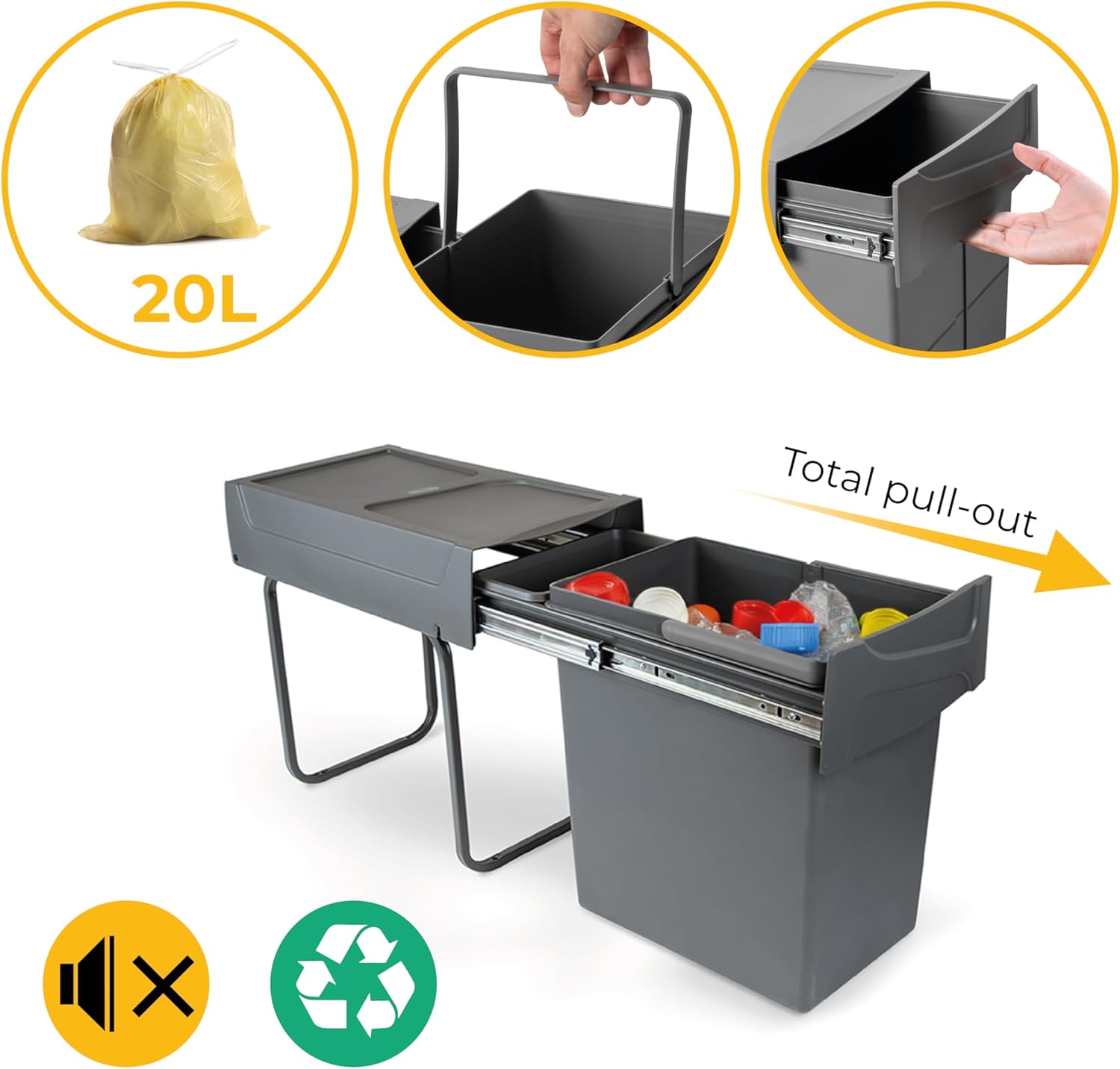 - Enthält einen herausnehmbaren 20-Liter-Behälter und eine Zusatzschale.Völladig abnehmbare Kugelführungen, geräuschlos mit Gummihalter am Verschluss.