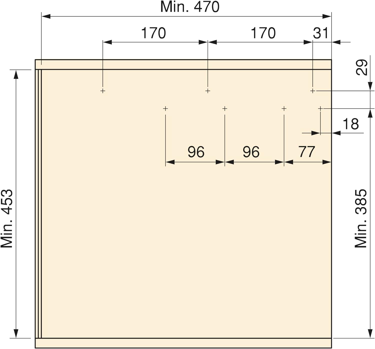 - Er ist für den Einbau in 45-mm-Module mit Innenmassen von mindestens 470 mm Tiefe und 453 mm Höhe geeignet. Kompatibel mit 16-, 18- und 19-mm-Platten.