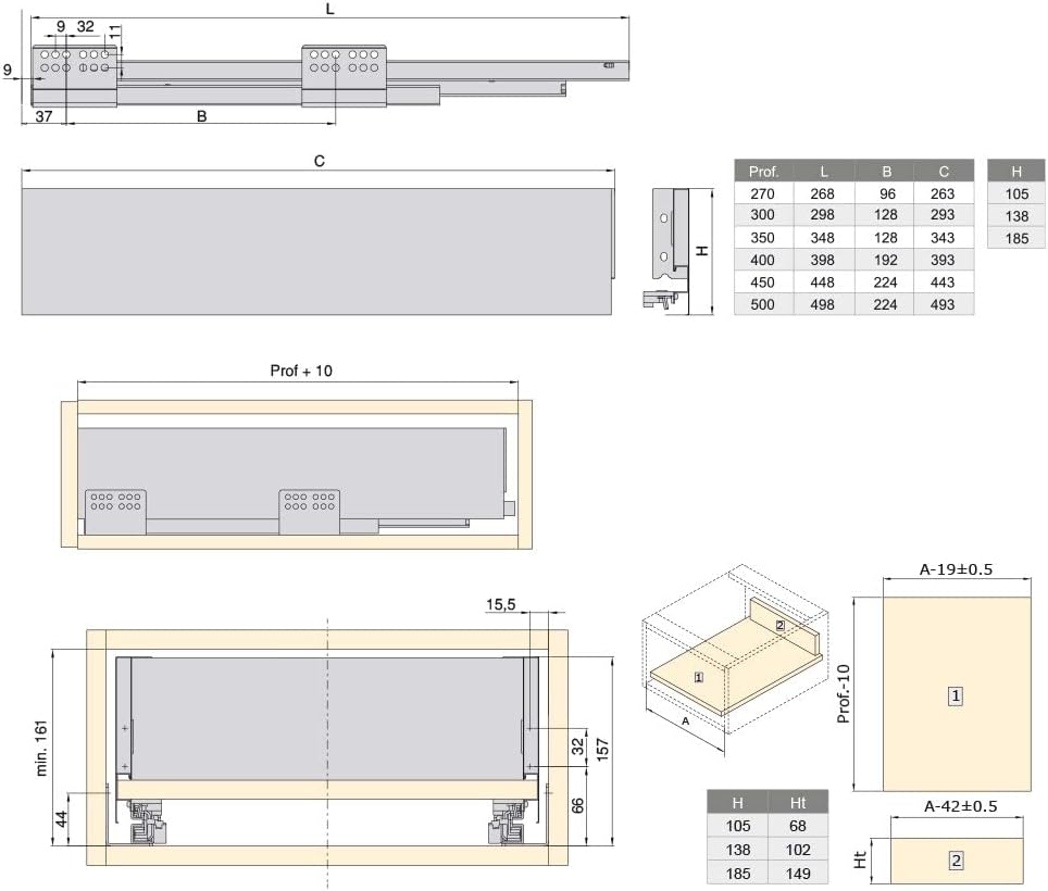 - Kit mit dem erforderlichen Zubehör zur Anbringung einer Aussenschublade mit einer Höhe von 105mm und einer Tiefe von 500mm