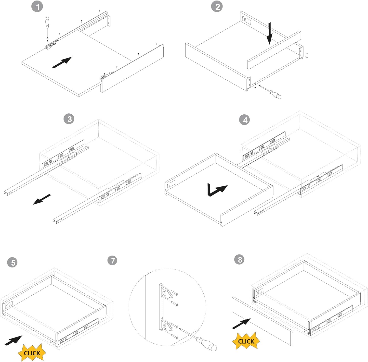 • Regulierung an der Schubladenvorderseite: ±2mm vertikal und ±1mm horizontal.