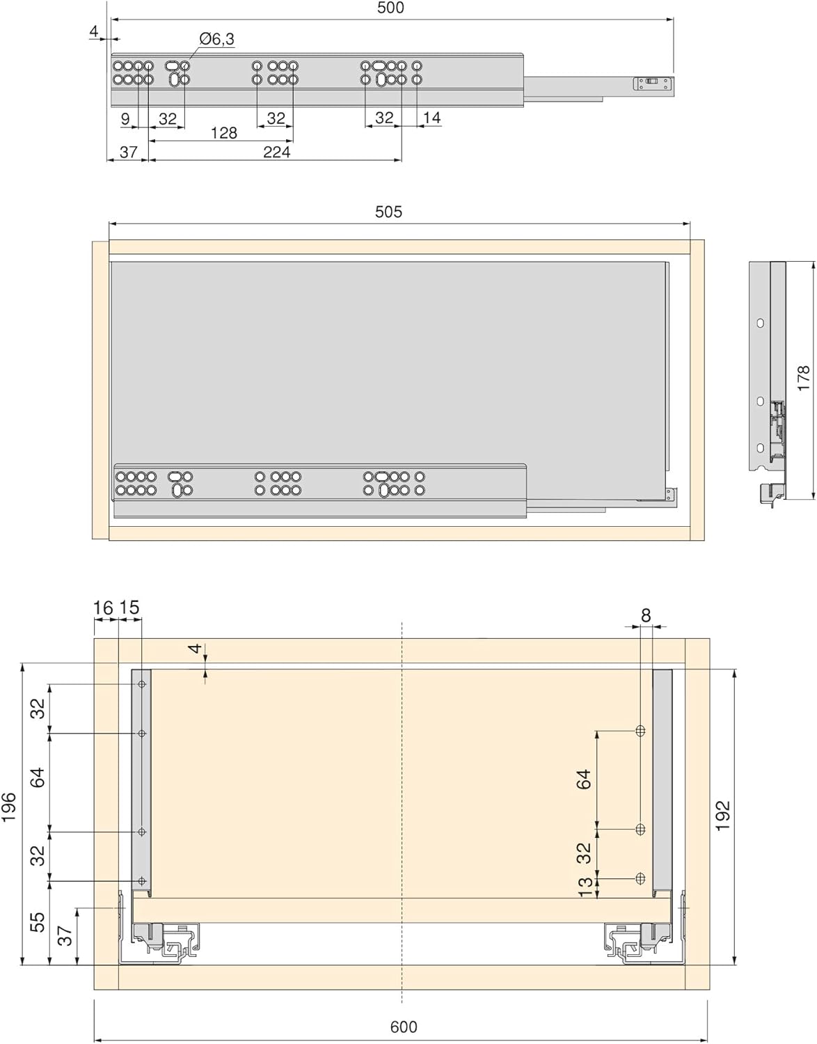 - Beschläge Kit erforderlich für die Montage einer Schublade mit einer Höhe von 178 mm und einer Tiefe von 500 mm, mit Ausnahme der Frontseite der Schublade in Modulen mit einer Breite von 600 mm und einer Seitendicke von 16 mm.