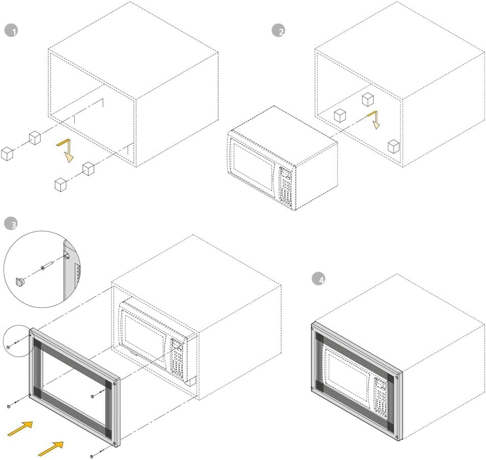 - Inklusive Montageschrauben, Schraubdeckeln und 4 Styroporklemmen zur Höhenverstellung der Mikrowelle.