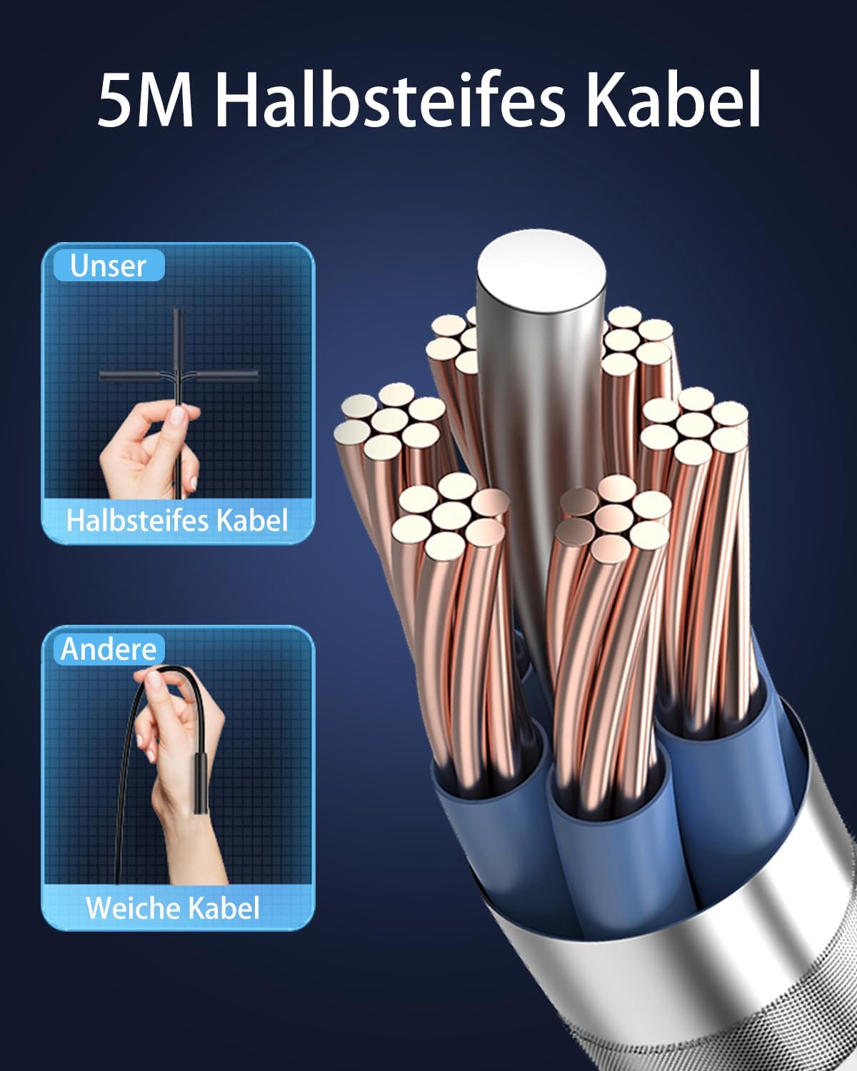 - ⚙️Packliste: Enthält 5M Schlangenkamera, Benutzerhandbuch, Typ-C-Kabel und 5 Stück Zubehör (einschliesslich Haken *1, Magnet *1, Seitenspiegel *1, Befestigungsschnalle *3). Hinweis: SD-Karte wird nicht unterstützt. Videoaufnahme und Fotoaufnahme