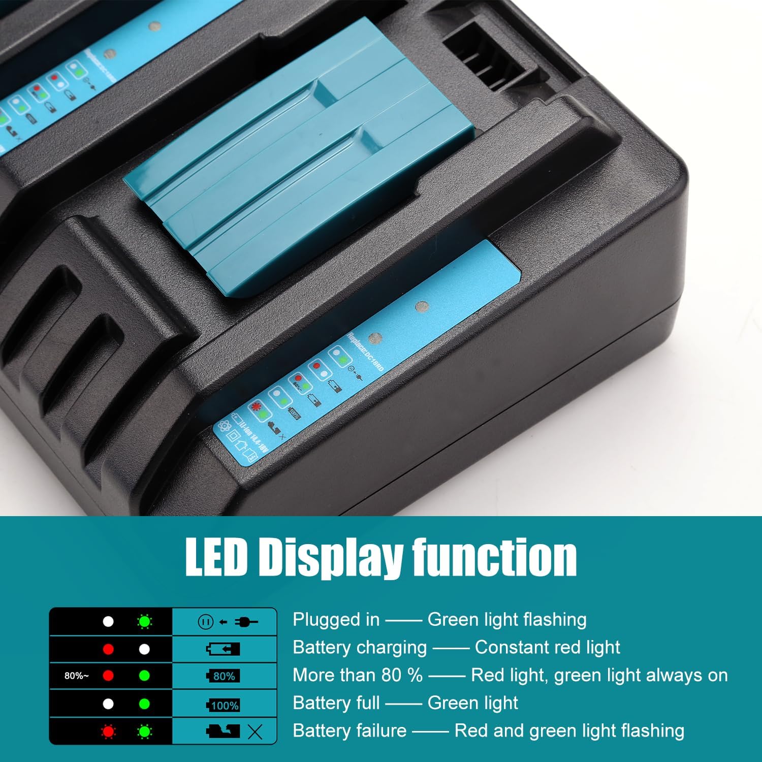 - [Ersatzladegerät für Makita Ladegerät] Eingang: 100-240V | Ausgang: 14,4-18V | Dual Port Schnellladegerät kann zwei Akkus gleichzeitig laden.